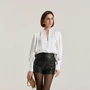 Рубашка выполнена из хлопковой ткани, свободного кроя. Рукава втачные, спущенные с отделочными элементами -рюши. Низ рукава на притачной манжете , воротник -стойка , рубашечного типа, застежки на петли-пуговицы. Длина по спинке 62 см.Длина рукава от втачного шва 55 см.