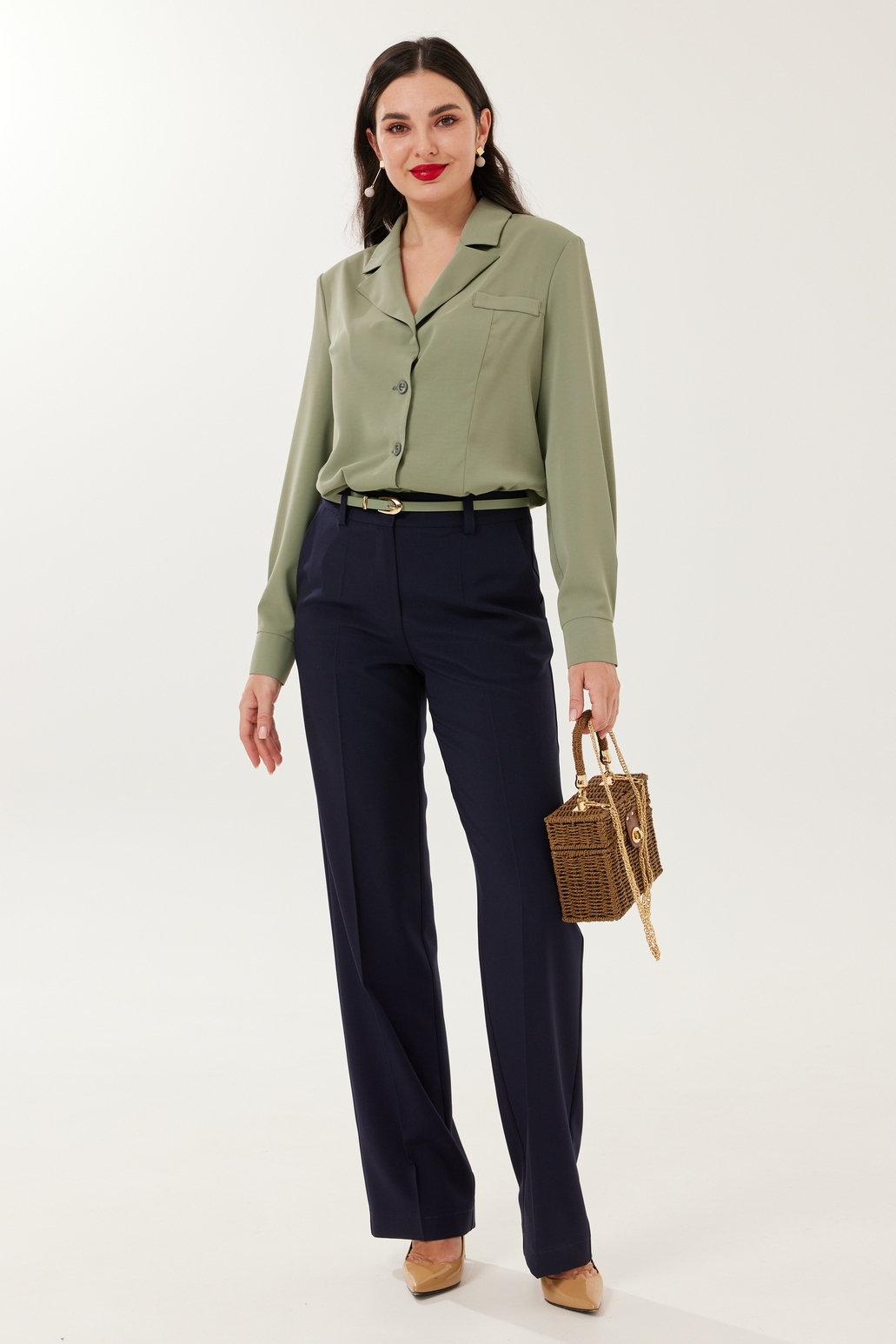 Блуза женская жакетного типа, полуприлегающего силуэта, выполнена из струящейся поливискозы. Блуза с центральной застёжкой на петли и пуговицы. Горловина оформлена воротником пиджачного типа. Правая деталь переда блузы с нагрудной выточкой, левая - с вертикальным рельефом и подрезом, в области груди обработана декоративная листочка. Спинка цельнокроенная с талиевыми выточками. Рукав втачной длинный, низ рукава обработан притачной манжетой, которая застёгивается на 2 петли и пуговицы.