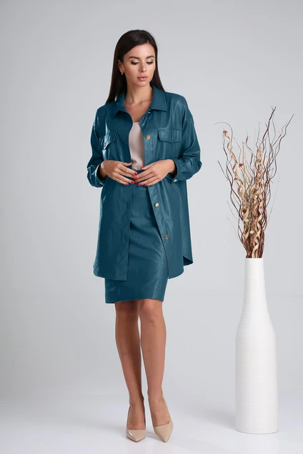 Рубашка с воротником и пуговицами спереди. Свободная посадка, заниженная линия плеч, длинный рукав, нагрудные карманы с клапанами на пуговице и незаметными боковыми карманами. Спинка с кокеткой. Без подкладки, с поясом.