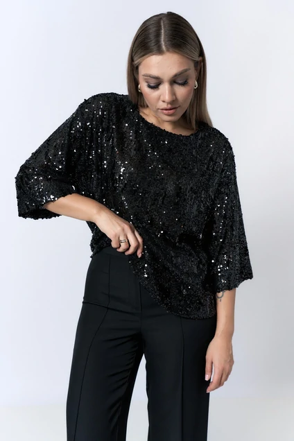 Блуза свободного силуэта. Из пайеточной,нарядной ткани. Горловина округлой формы. Рукав спущенный,¾.