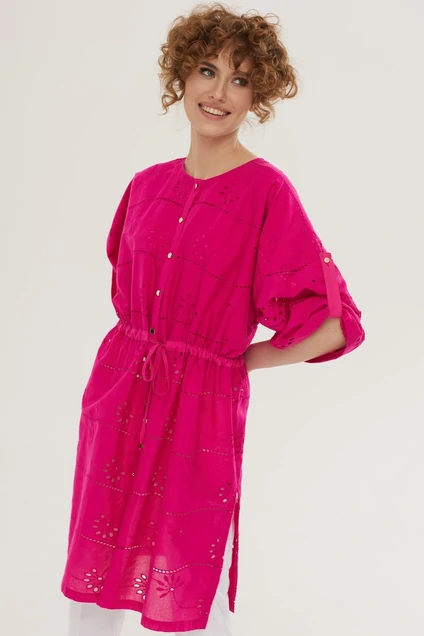 Блузка удлиненная из хлопковой ткани «шитье». Застежка по переду на петли и пуговицы. Вырез горловины круглой формы. Рукава свободные с регулировкой длины на пату. По талии блузка регулируется кулисой с завязкой. В боковых швах разрезы. Верхняя часть переда на хлопковой подкладке. рукав 65 см.