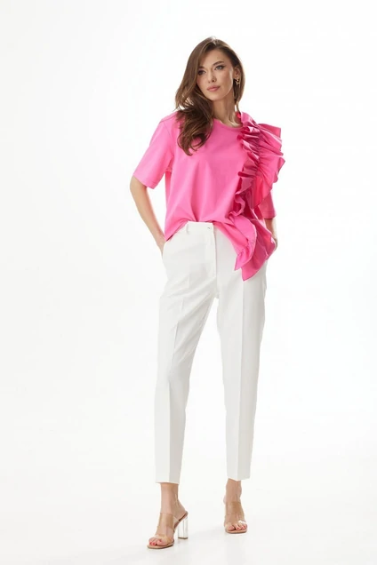 Блузка свободной формы из трикотажного полотна. Вырез горловины круглой формы. Рукава короткие. На переде декоративный элемент в виде оборки. Рукав 24 см. Ширина плеча - 16 см.