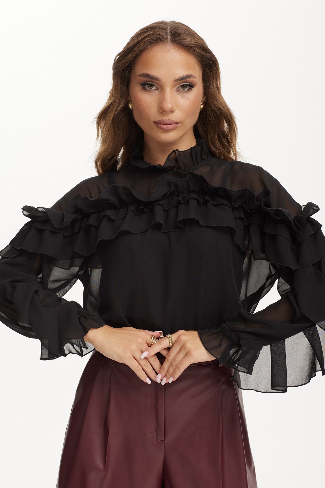 Блузка из шифоновой ткани прямого силуэта. Горловина круглой формы с оборкой. Застежка по горловине спинки на потайную молнию. Рукав прямой, низ собран на резинку. По рукаву и переду оборка. В комплекте топ из