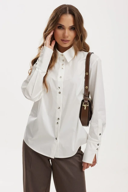 Блузка прямого силуэта. Застежка на петли и пуговицы. Воротник рубашечный. Рукав прямой со складками понизу и манжетой фигурной формы. Застежка манжеты на петли и