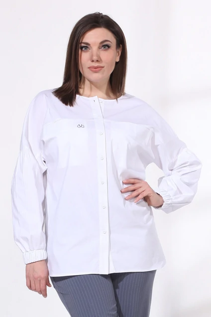 Хлопковая рубашка свободного прямого силуэта со спущенной линией проймы, отрезной кокеткой и карманами по переду. Застежка на планку с пуговицами. Рукава втачные длинные с притачными манжетами на резинке. Низ фигурный. Карман декорирован вышивкойс логотипом бренда. Длина рубашки - 72 см.