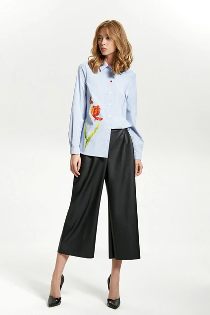 Рубашка с отложным воротником в тон рубашки. Изделие выполнено из высококачественного рубашечного хлопка. На правой полочке расположена цветная печать, которая не оставит вас незамеченной, даже в душном офисе. Изделие с цельнокроеной планкой с застежкой на петли-пуговицы. Внутренняя часть стойки выполнена из материала в цвет печати. На рукавах манжеты с застежками на петли пуговицы.