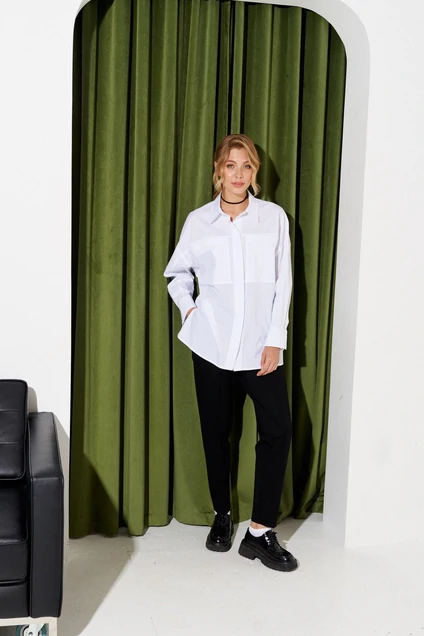 Женская оверсайз рубашка. Из высококачественного хлопкого материала. Детали: свободный покрой, прямой силуэт, спущенная линия плеча, отрезная кокетка, накладные карманы, фигурные разрезы по низу боковых швов, застежка на петли и пуговицы-потайная, рукава длинные с манжетами.