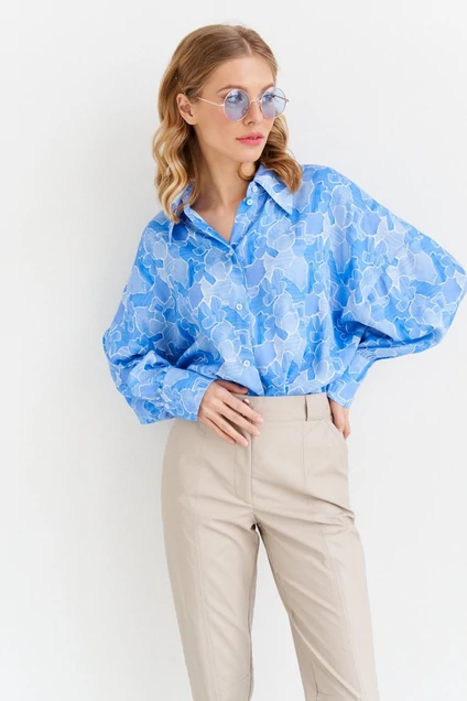 Рубашка женская, оверсайз. Выполнена из х/б материала. Горловина с отложным воротником на стойке, с застежкой на петлю и пуговицу. Рукав спущенный с сборкой по низу, притачной манжетой и застежкой на петлю и пуговицу. Полочка состоит из двух частей. Между которыми расположена застежка на петли и пуговицы. На которой расположена застежка на петли и пуговица. Спинка с притачной кокеткой. Боковые швы с разрезами.
