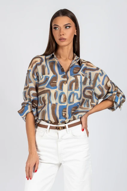 Блузка-рубашка женская, прямого силуэта со спущенным плечом. Передняя часть из двух частей, с центральной бортовой застежкой на 6 петель и пуговиц. На переде настрочены карманы. Спинка изделия цельная. Рукав с настроченной патой и пуговицей. Низ рукава с притачной манжетой, застегивающейся на 1 петлю и пуговицу. Воротник рубашечного типа с отрезной стойкой. Уход: бережная стирка при температуре не выше 30°С.