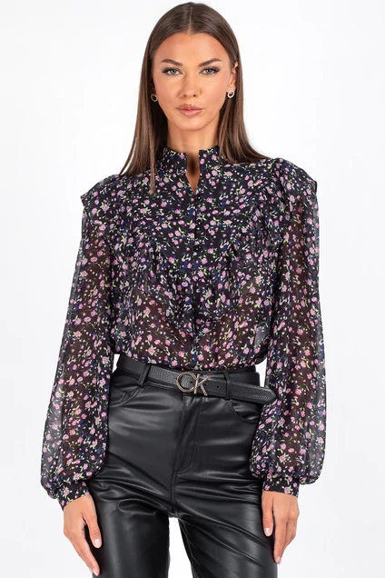 Блузка с длинным рукавом выполнена из ткани с цветочным принтом — мелкие розовые, сиреневые и зелёные цветы на чёрном фоне создают эффект глубины и утончённости. Идеально сочетается с кожаными брюками, юбками и классическими джинсами.