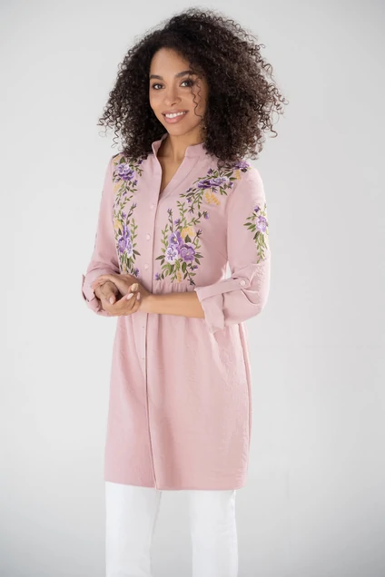 Удлиненная рубашка с вышивкой — один из самых популярных предметов женской одежды. Она необыкновенно универсальна в комплектации, и прекрасно смотрится, как с брюками, так и с джинсами, придает вашему стилю элегантность. Но самая замечательное достоинство удлиненной рубашки — это то, что она вытягивает фигуру и стройнит практически любой силуэт. Блузка женская свободного силуэта с художественной вышивкой, удлиненная, из блузочно-плательной ткани, предназначена для повседневной носки в летний период. Блузка отрезная выше линии талии, нижние части переда и спинки со сборкой.