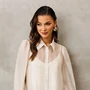 Блузка из креп-шифона с напылением. Прямого силуэта, с втачным рукавом вверху со сборкой внизу на манжете с застежкой на петлю-пуговицу и рюшей на манжете. Полочка с центральной застежкой на петли-пуговицы на цельнокроеной планке. Воротник рубашечный отложной на стойке. Внизу по боковым швам обработаны разрезы. К блузке идет в комплект атласный топ на регулируемых бретелях прямого силуэта, на широкой обтачке. Полочка с V-образным вырезом и нагрудной вытачкой.