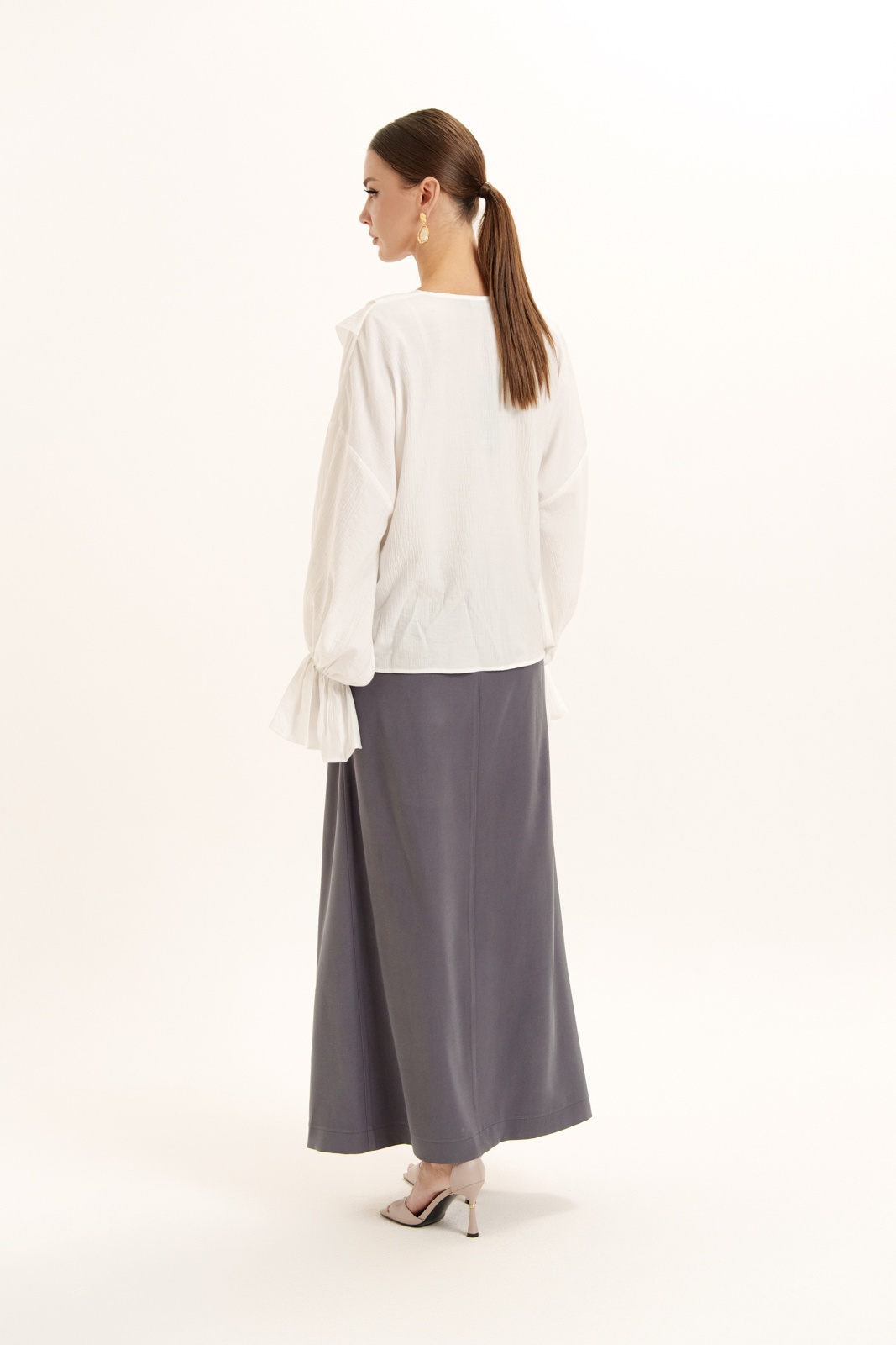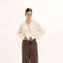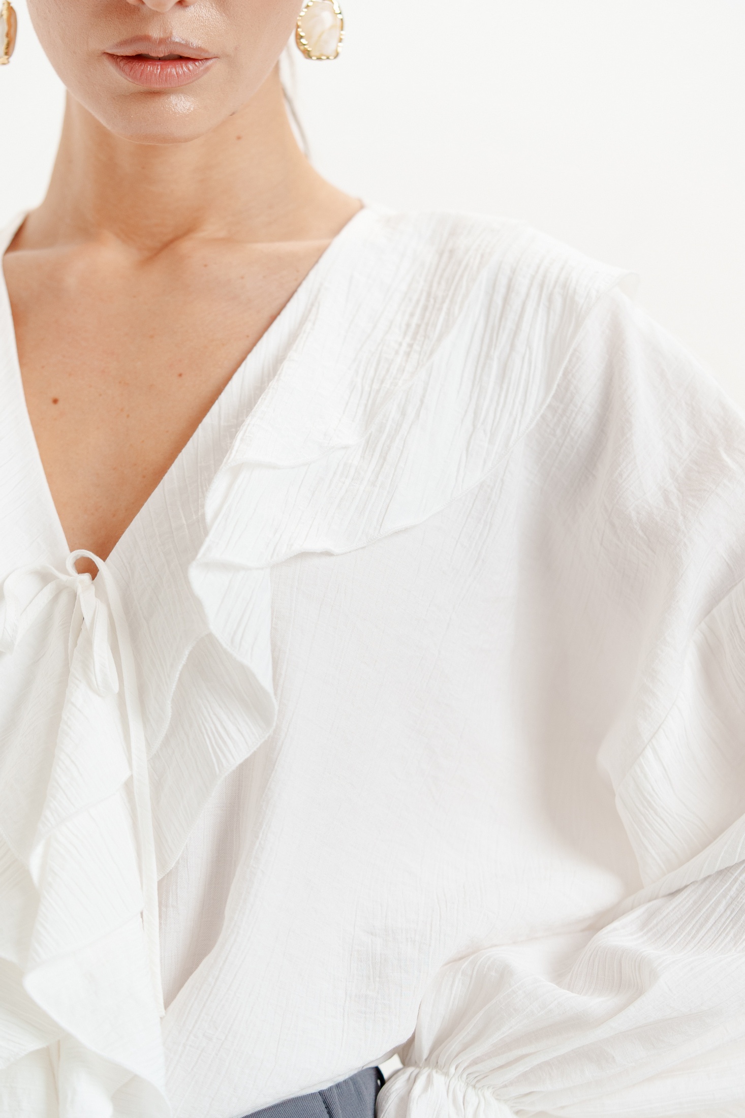 Блузка 6458-5 Deesses сочетает в себе нежность и стиль. Коллекция бренда Deesses выполнена из легкой плательной ткани, которая имеет приятную фактуру и хорошо держит форму. Свободный силуэт делает модель универсальной для любого события. V-образный вырез с воланами добавляет изюминку, а застежка на завязки подчеркивает оригинальность дизайна. Объемные рукава собраны на эластичную тесьму, что создает эффектный вид. В белом цвете эта блузка подходит как для повседневных, так и для вечерних образов. Отличный выбор для весны и лета, она прекрасно сочетается с различными аксессуарами и другими элементами гардероба.