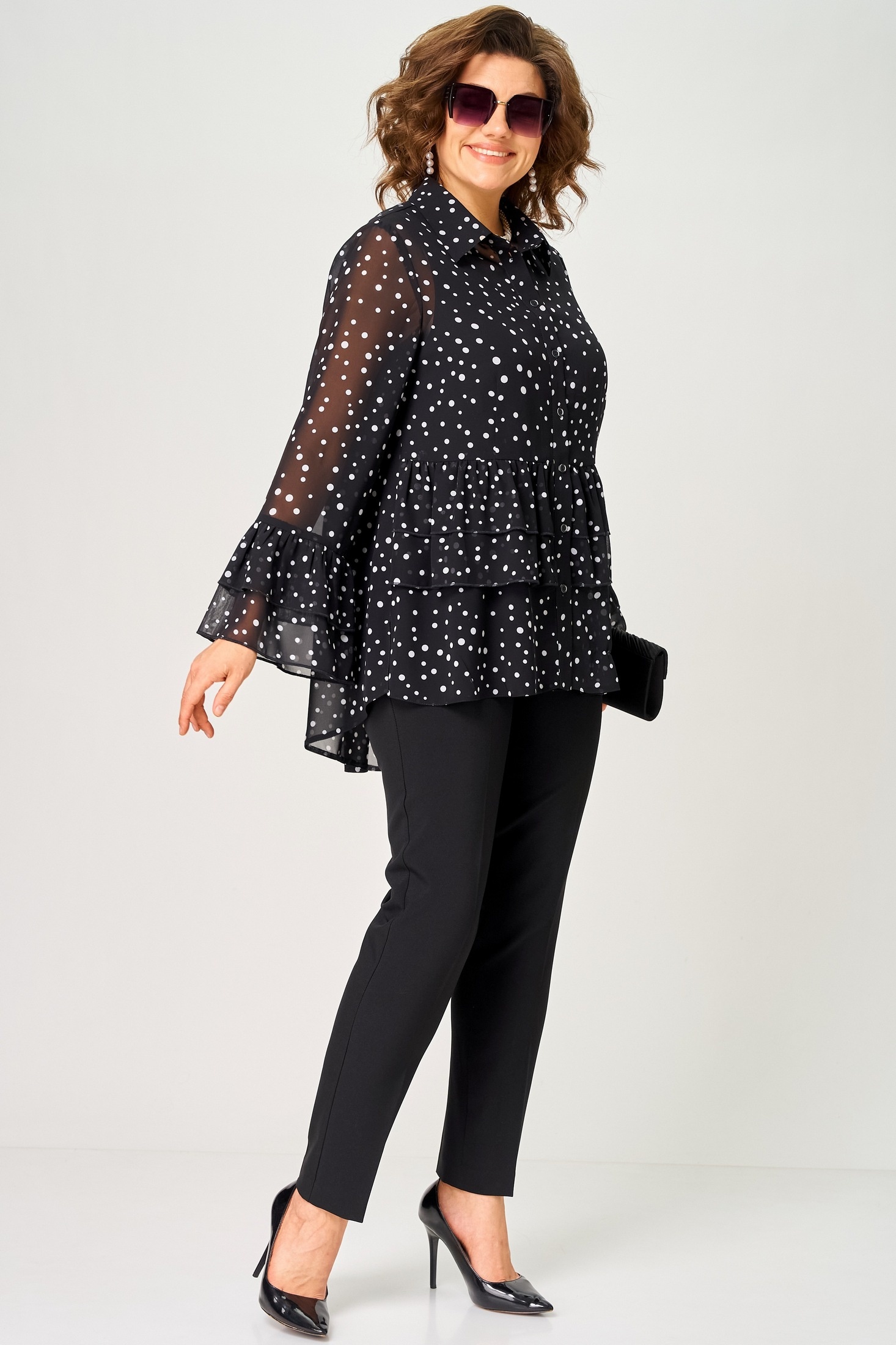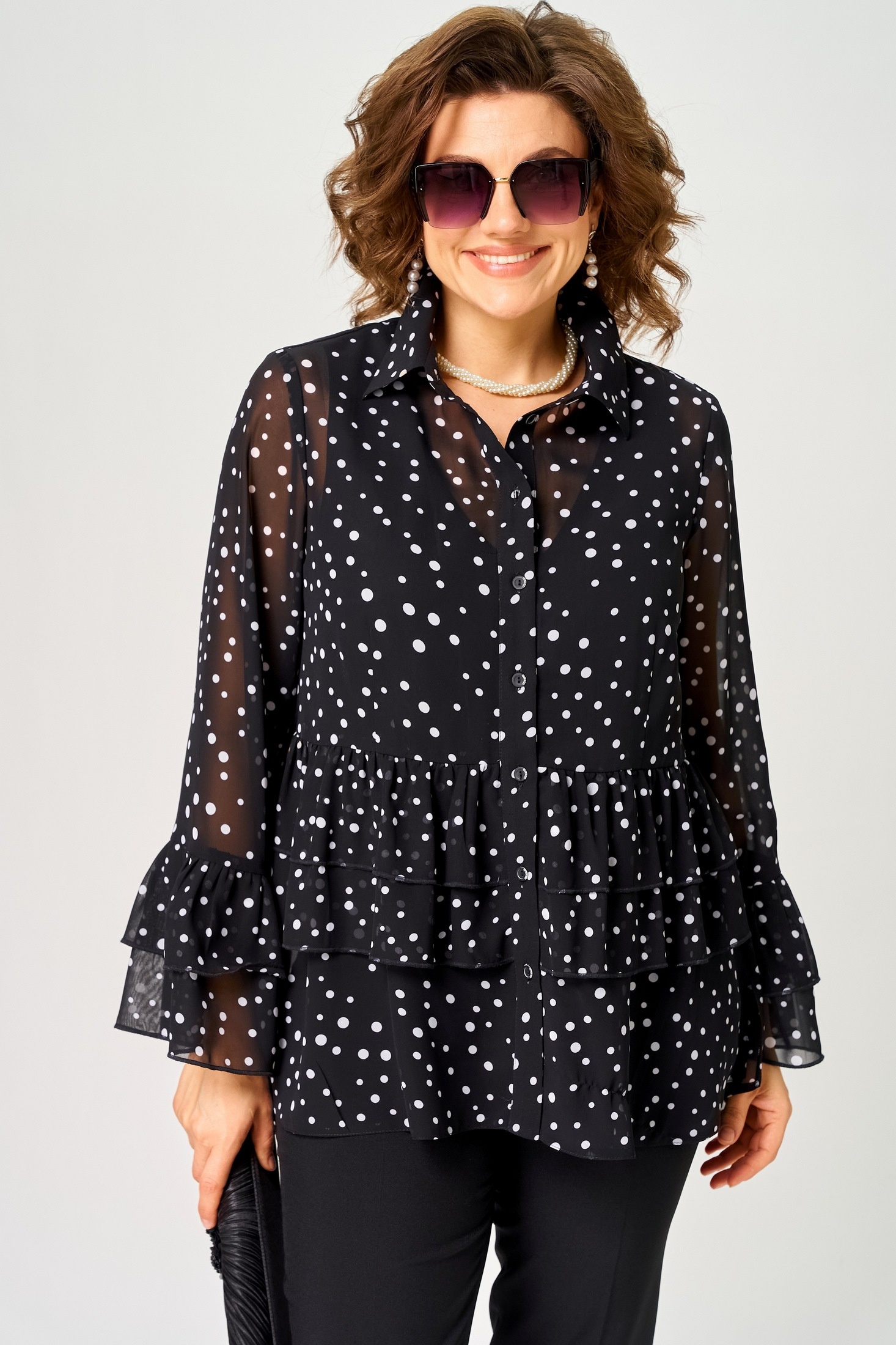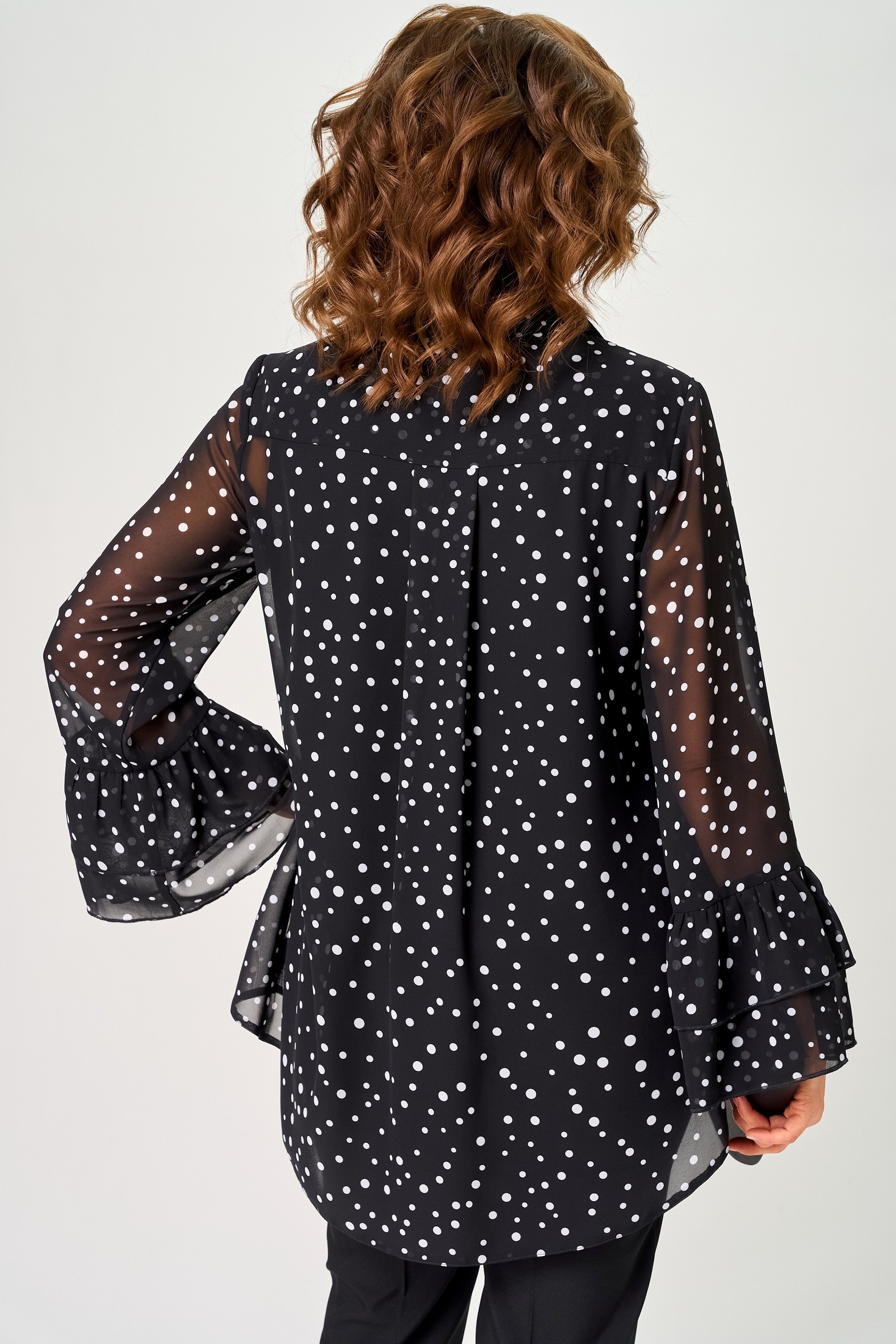 Блузка 7221С принт мелкий горох EVA GRANT из коллекции бренда EVA GRANT выполнена из шифона, что гарантирует лёгкость и комфорт. Полуприлегающий силуэт с воротником-стойкой рубашечного типа и втачным рукавом, декорированным притачными воланами, создает стильный и женственный образ. Блузка подчеркивает вашу индивидуальность благодаря принту в мелкий горох. Застежка на пуговицах и фигурный низ добавляют оригинальности. Этот нарядный и повседневный элемент гардероба отлично подходит для весенне-летнего сезона. Боковые разрезы придают изделию дополнительную воздушность и свободу движений. Принт и воланы гармонично дополняют дизайн.
