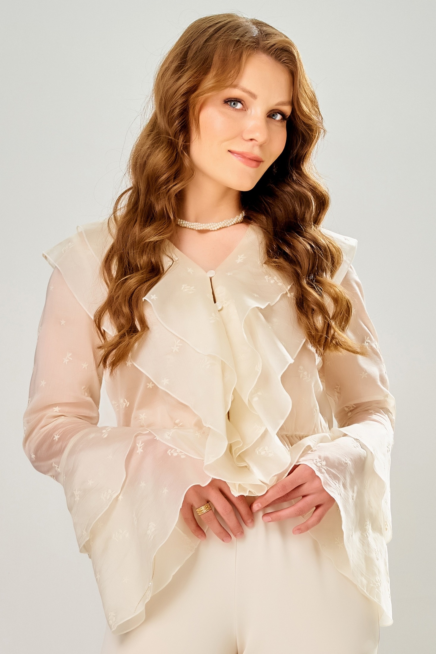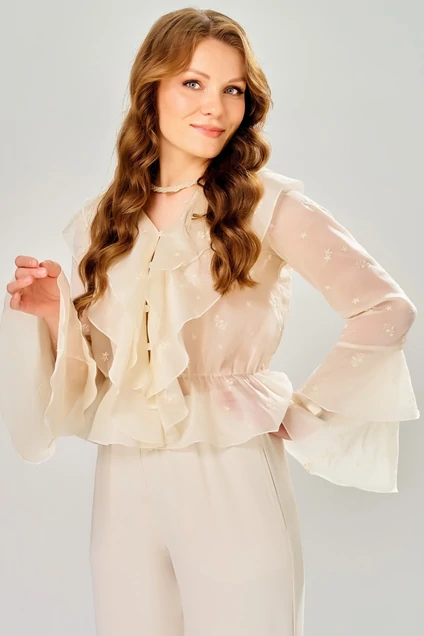 Блузка 20812 экрю FITA — это элегантное сочетание стиля и комфорта. Коллекция бренда FITA выполнена из текстильной ткани "Вуаль Верона", объединяющей тенсел и полиамид для легкости и прочности. Блузка имеет отрезной фасон по талии с эластичной резинкой, что создает идеальный силуэт. Застежка на пуговицы с потайной планкой добавляет элегантности. Декоративный двойной волан плавно переходит с полочки на спинку, создавая воздушный образ. Втачные одношовные рукава с двойными воланами по низу подчеркивают необычайный стиль. Эта женственная блузка идеально подходит для повседневного и нарядного выхода, особенно в весенне-летний период. Нежный цвет экрю завершает образ, позволяя комбинировать изделие как с брюками, так и с юбкой.