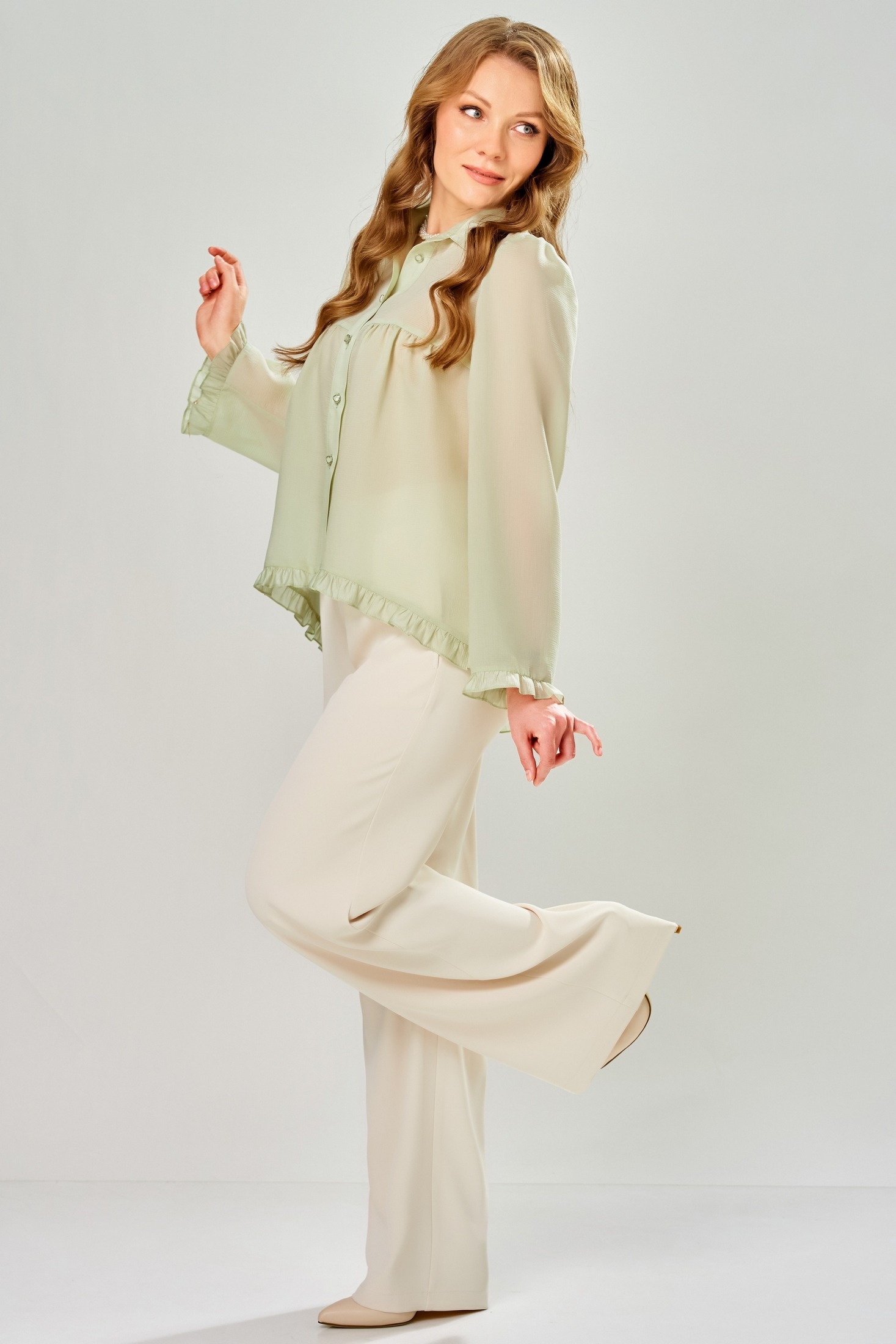 Блузка 20841 лаймовый FITA сочетает в себе стиль и комфорт. Женская блузка 'Найда' из коллекции бренда FITA выполнена из материала 'Вуаль Верона', который включает тенсел и полиамид, обеспечивая легкость и дышащие свойства. Фасон с кокеткой и легкой сборкой по полочке создаёт элегантный силуэт, который расширяется к низу. Однобортная застежка на пуговицы с отрезной планкой добавляет изюминку дизайну. Блузка украшена рюшами по подолу и рукавам, придавая образу женственности и нарядности. Воротник-стойка рубашечного типа дополняет детали. Подходит для повседневной и нарядной носки, особенно весной и летом. Выполнена в трендовом лаймовом цвете, она станет ярким акцентом вашего гардероба.