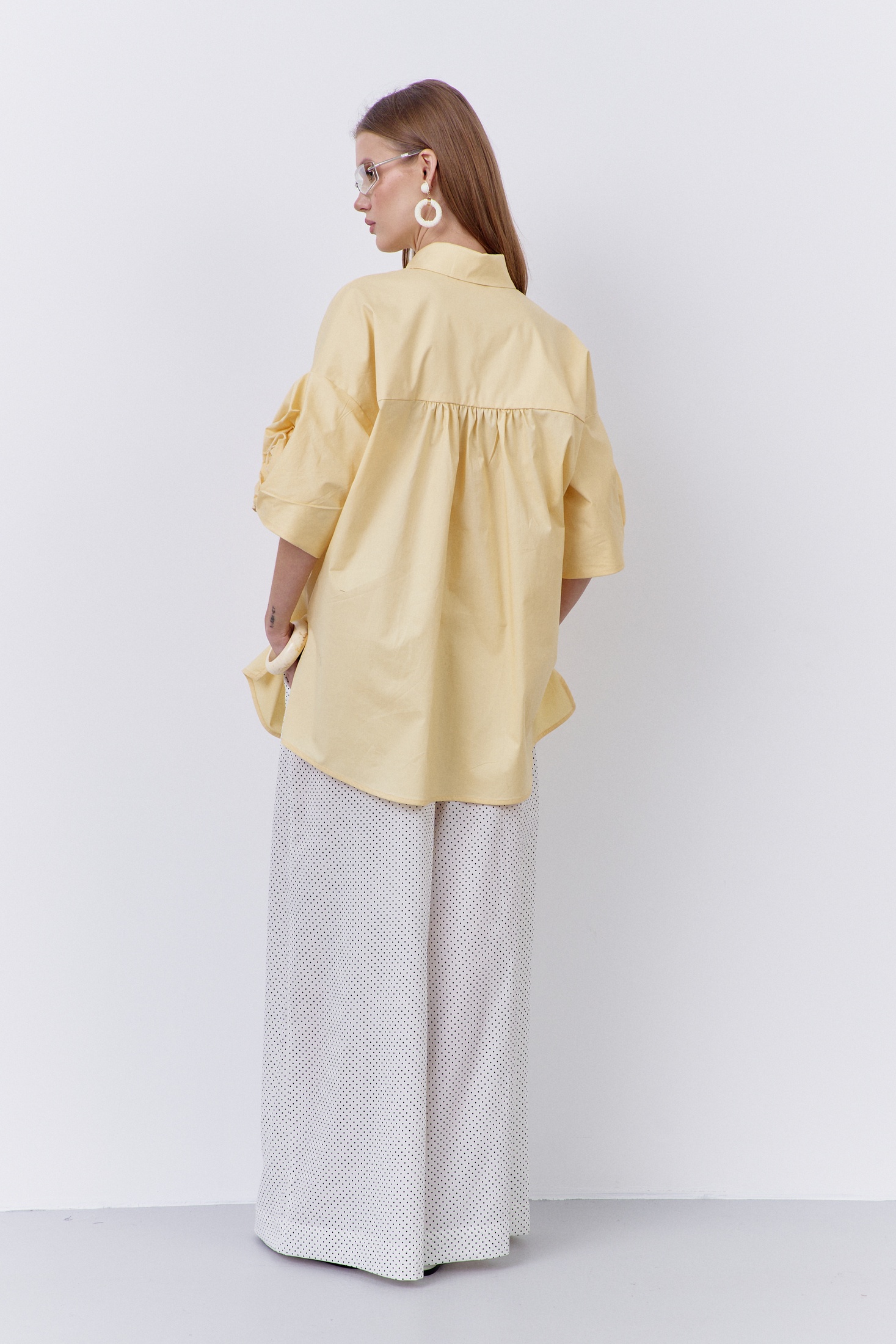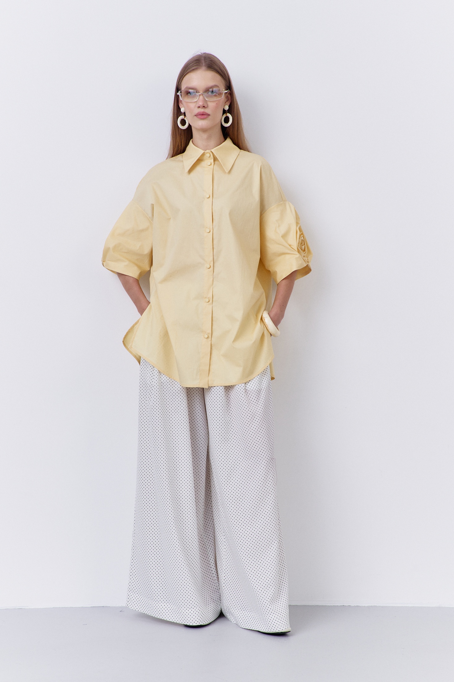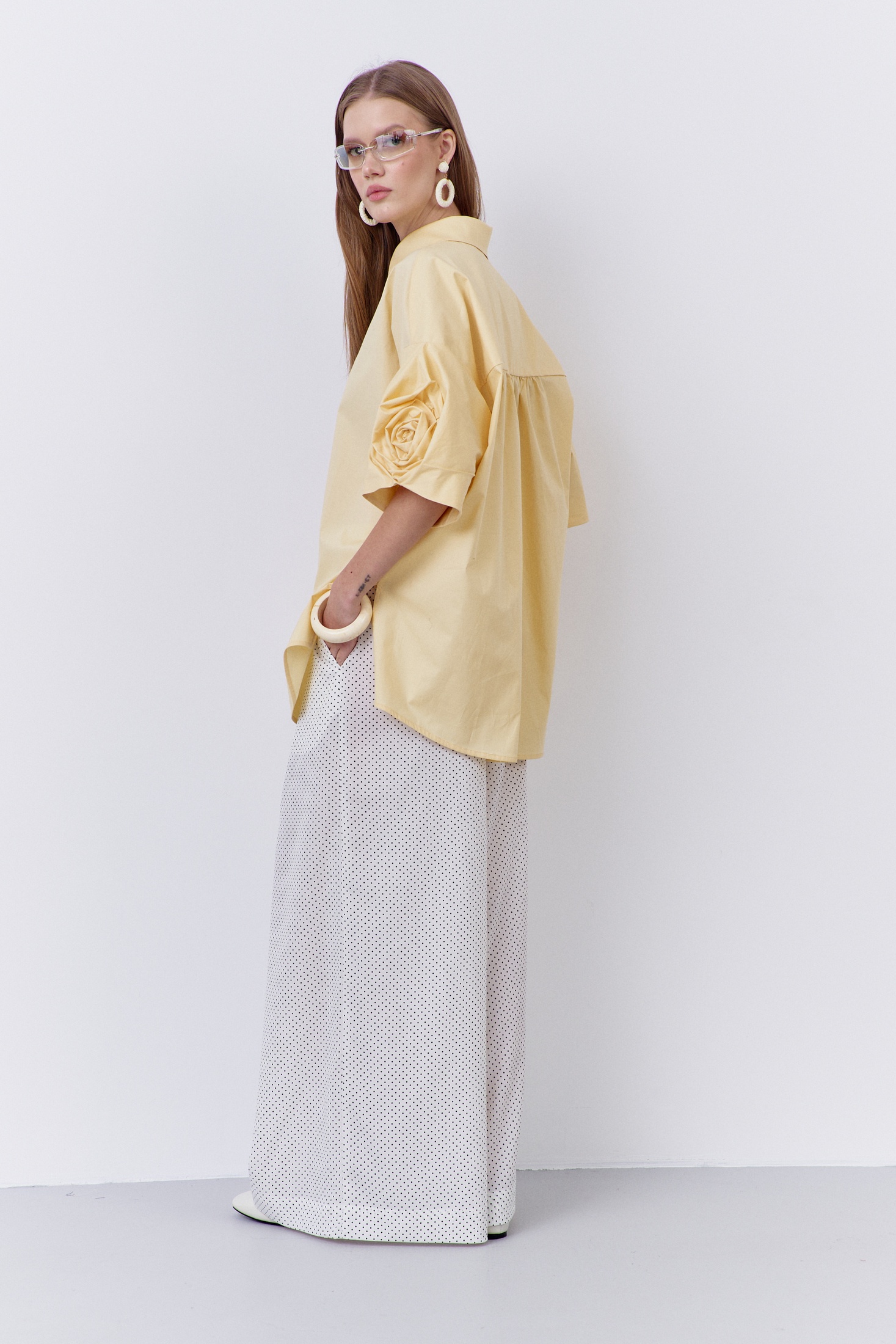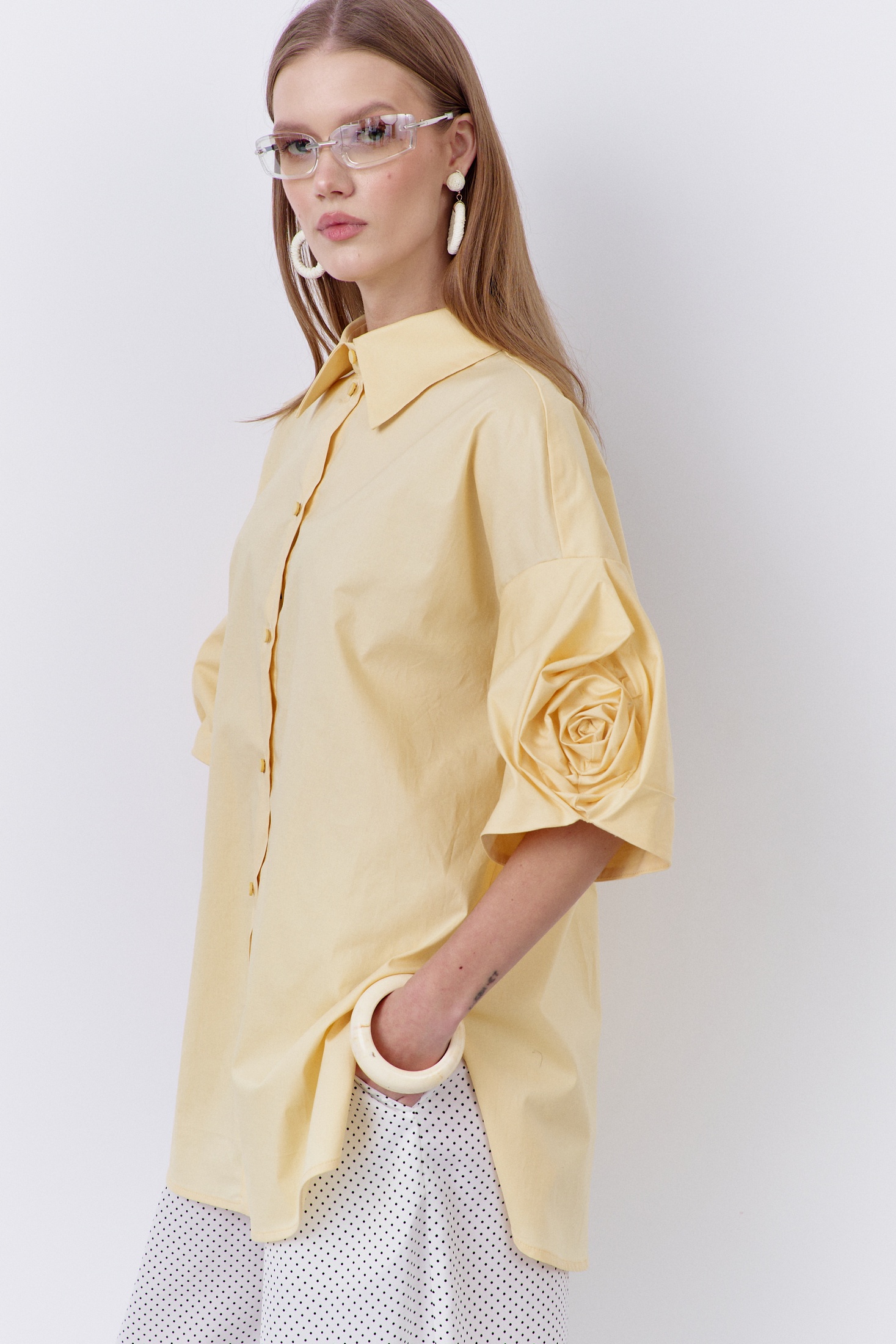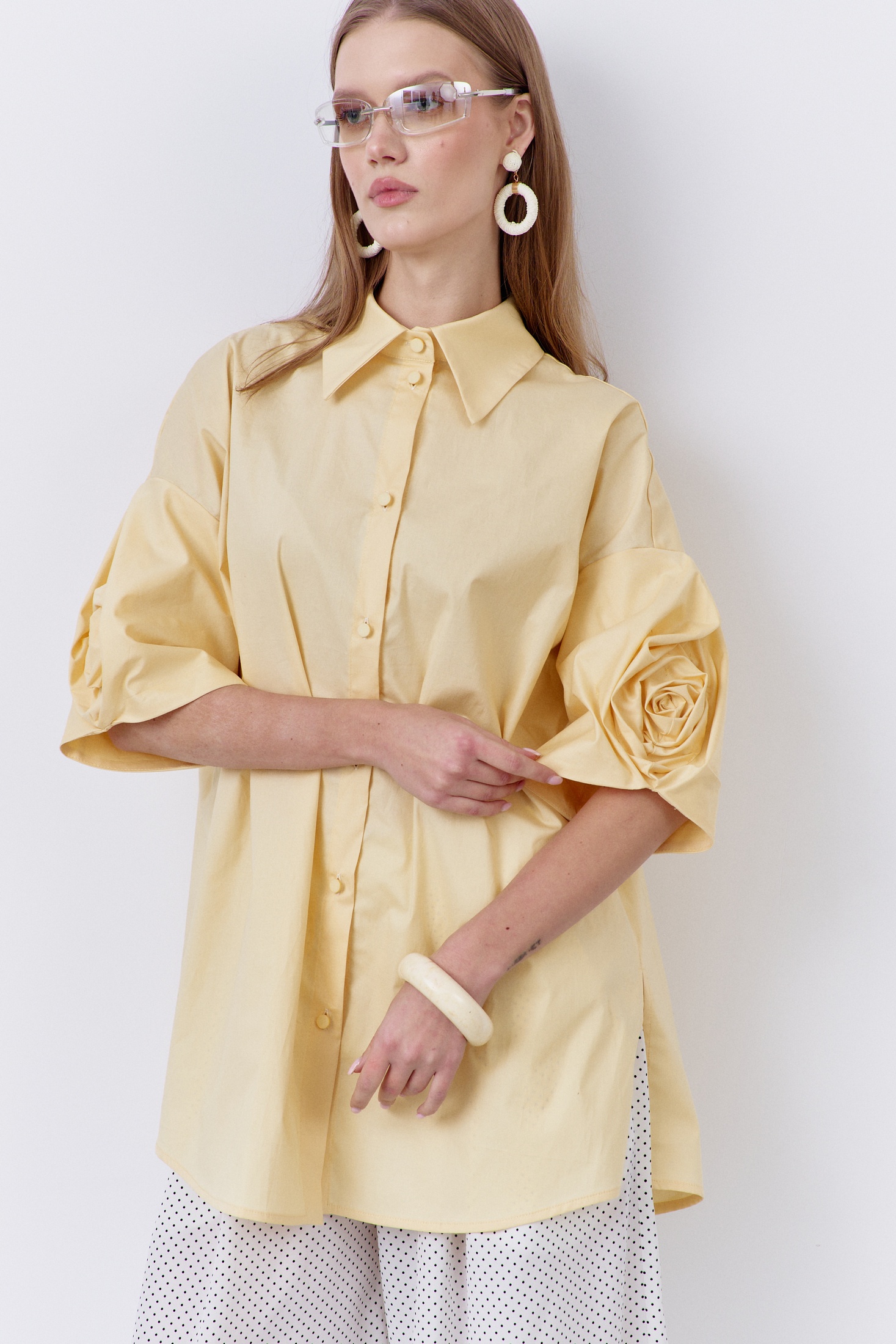 Блузка 2085 FLAIM от коллекции бренда FLAIM идеально подходит для создания модного и свежего образа. Выполненная из 100% хлопка, она обеспечивает комфорт и воздухопроницаемость, что делает ее идеальной для весенне-летнего сезона. Свободный силуэт и декоративные рукава с изящной розой придают ей оригинальность. Центральная застежка на петли и пуговицы добавляет практичности, а спинка с отрезной кокеткой и сборкой подчеркивает стиль и уникальность изделия. Блузка представлена в жизнерадостном желтом цвете, который оживит ваш гардероб. Идеально сочетается с повседневными и молодежными образами, делая их более выразительными.