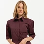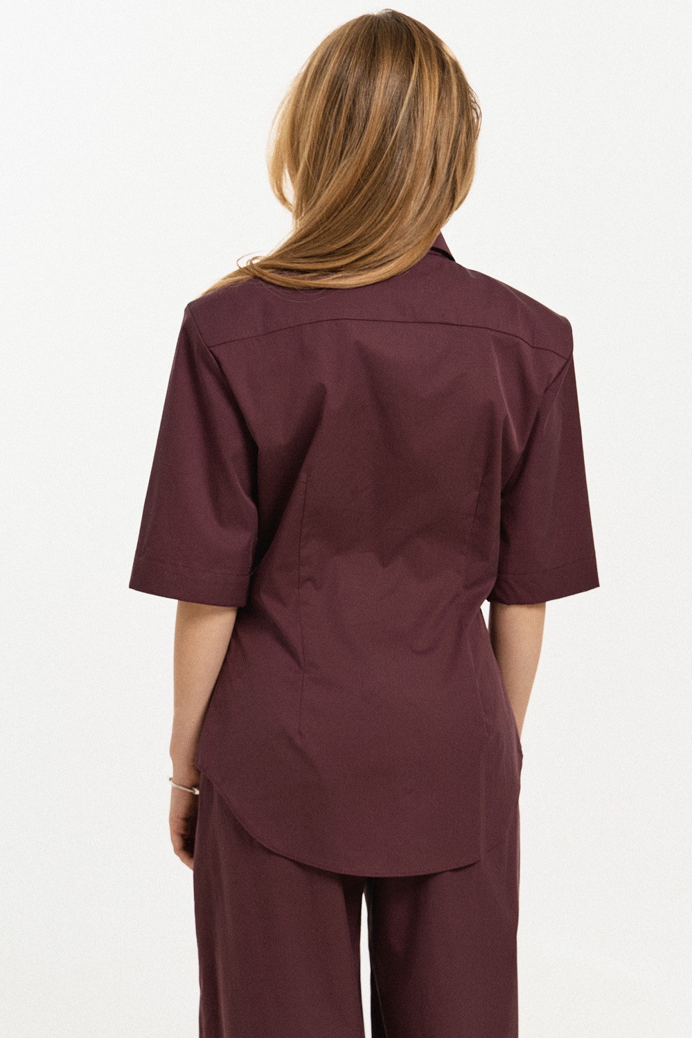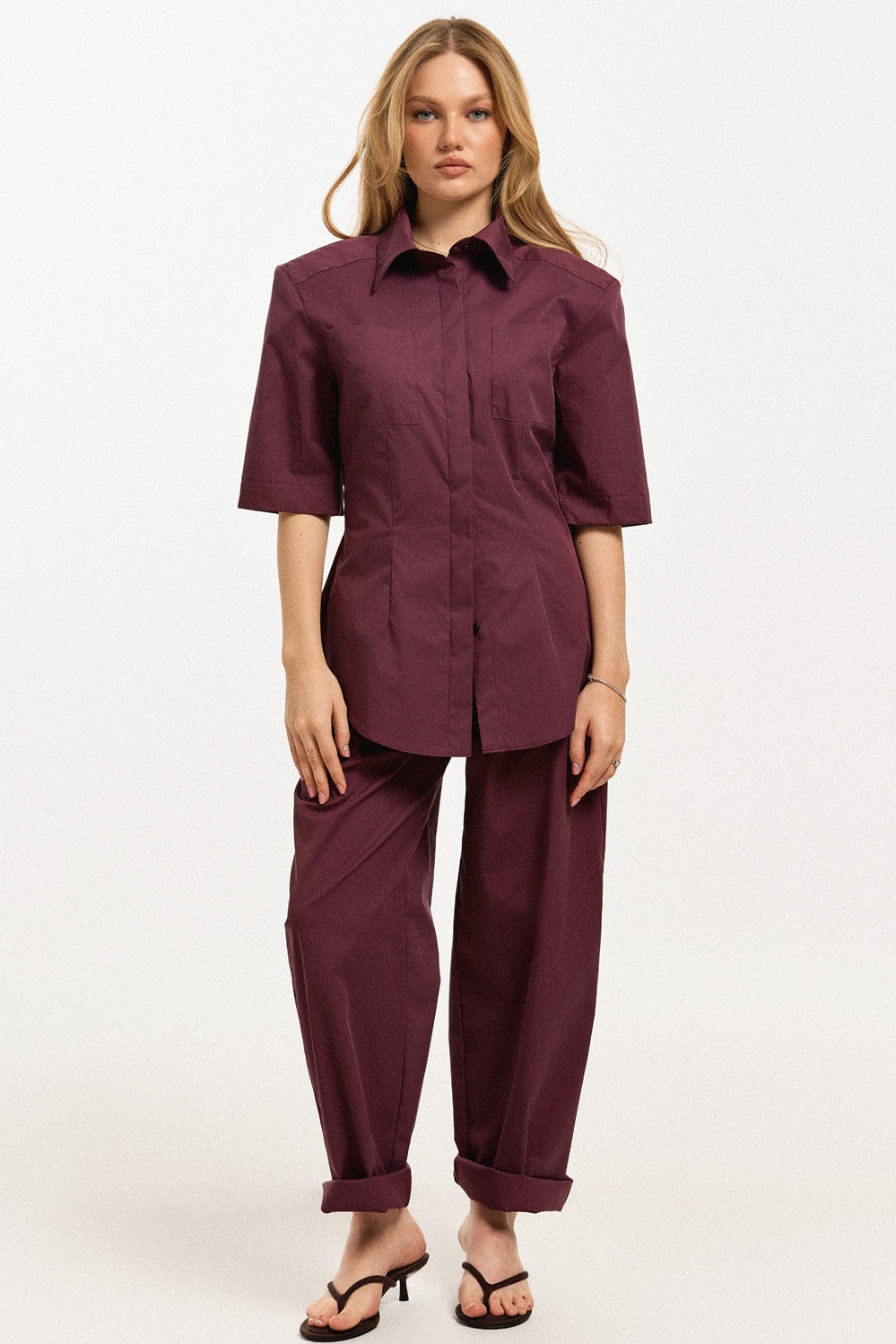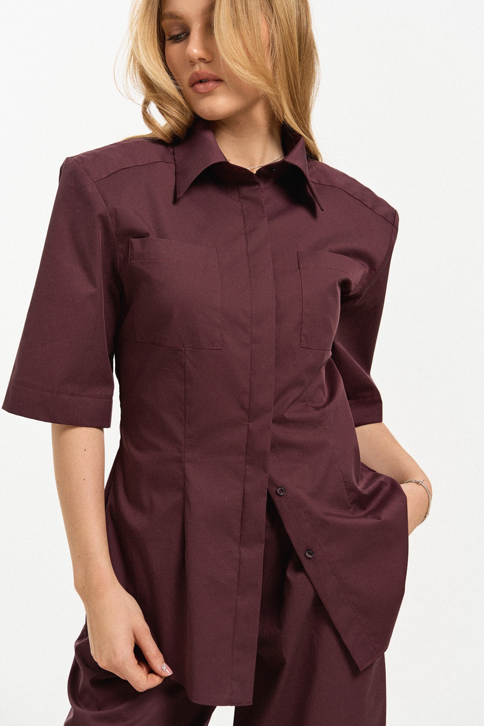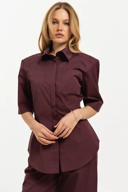 Блузка 2683 баклажан JRSy от коллекции бренда JRS предлагает модное решение для стильных женщин. Изготовленная из смесового хлопкового полотна (72% хлопка), блузка обеспечивает комфорт и легкость движения благодаря добавлению полиэстера и эластана. Отличительная черта — приталенный крой с вытачками и съемные подплечники, которые добавляют акцент на линии плеч. Воротник-стойка и центральная застежка на пуговицы подчеркивают офисный стиль, идеально подходя для деловых встреч. Накладные карманы на груди добавляют функциональности, а рукава длиной до локтя делают её удобной для демисезонных выходов. Фигурная линия низа и баклажановый цвет создают стильный образ, гармонируя с разнообразными элементами гардероба. Длина изделия составляет 71 см, а длина рукава — 31,5 см, что делает её практичным выбором для повседневного ношения.