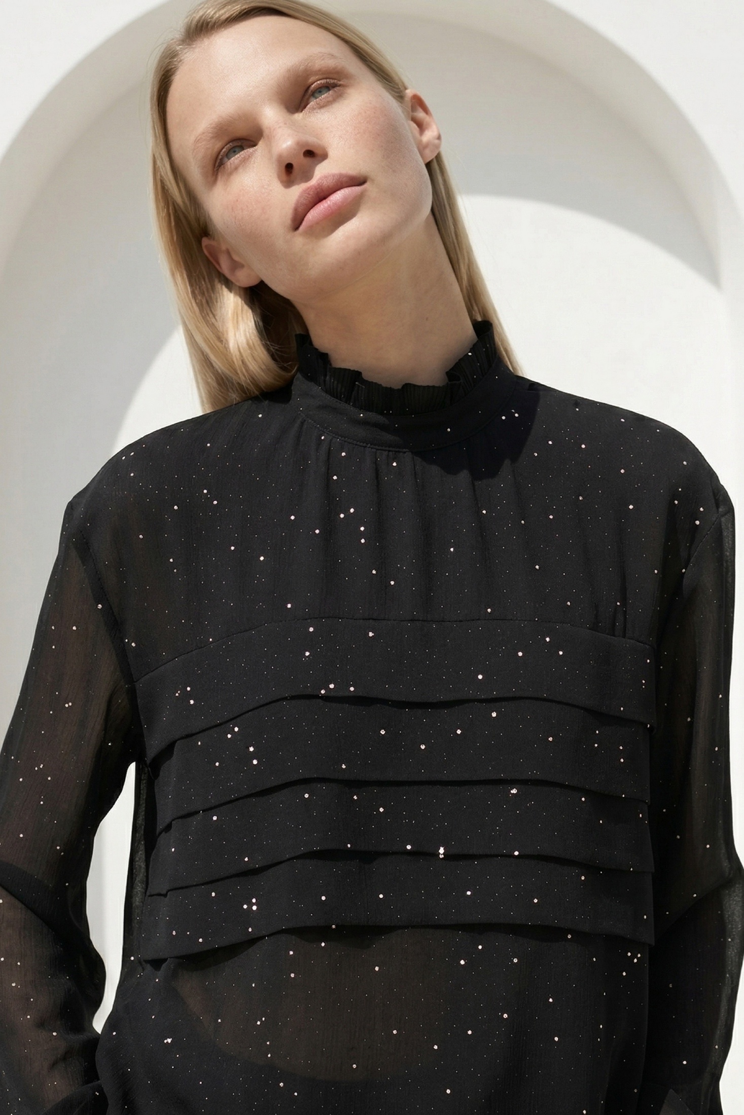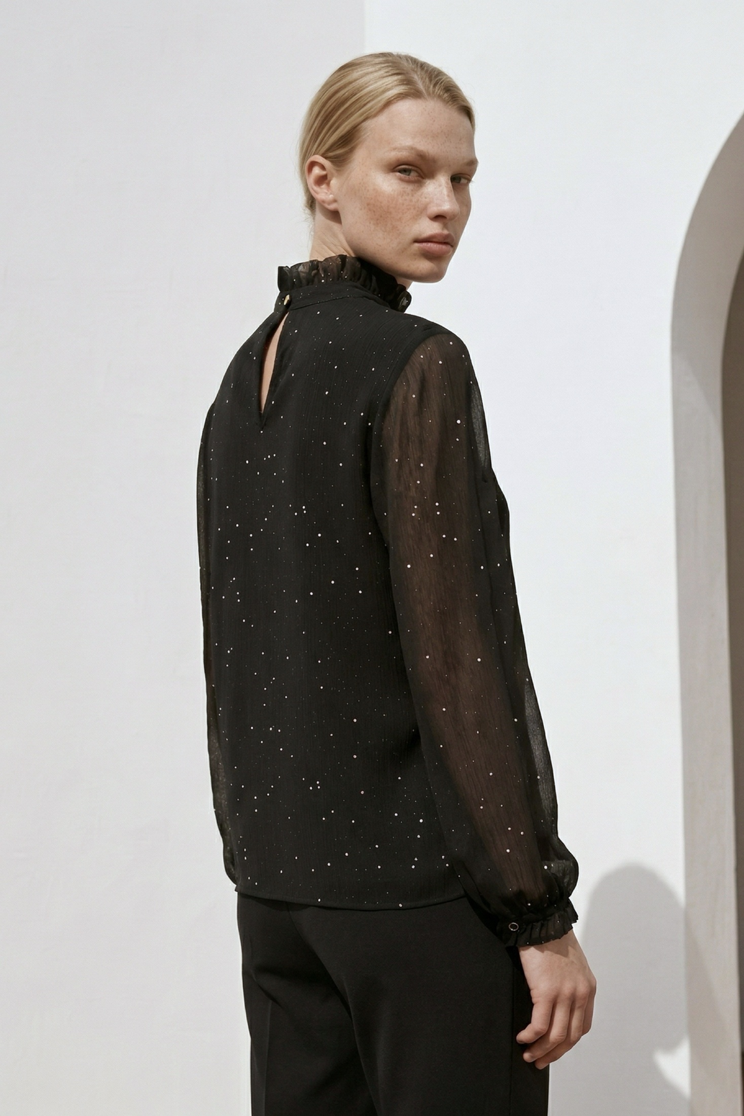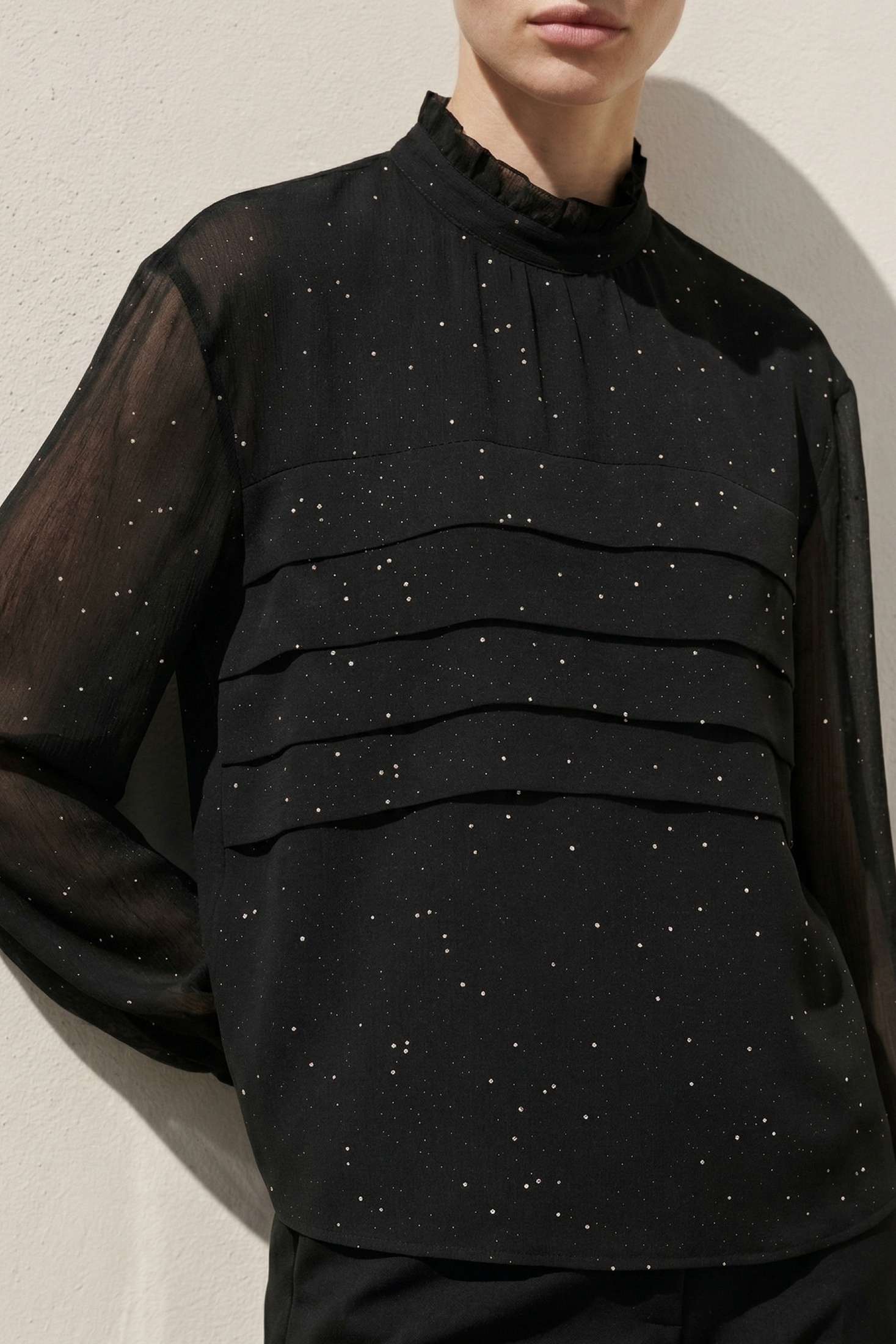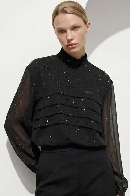 Блузка 5058 Lissana представляет собой уникальный элемент вашего гардероба. Коллекция бренда Lissana предлагает изысканный дизайн с воротником-стойкой и деликатными складками на груди. Изготовленная из 100% полиэстера, блузка обеспечивает комфорт и легкость в носке, идеально подходя для демисезонного периода. Стильные втачные рукава с манжетами и застёжкой на пуговицу придают изделию современный вид. Черный цвет с блестящими элементами добавляет нотку изящества и подходит для вечерних и праздничных мероприятий. Элегантность этой модели позволяет сочетать её с различными нарядами, создавая стильные повседневные и офисные образы.