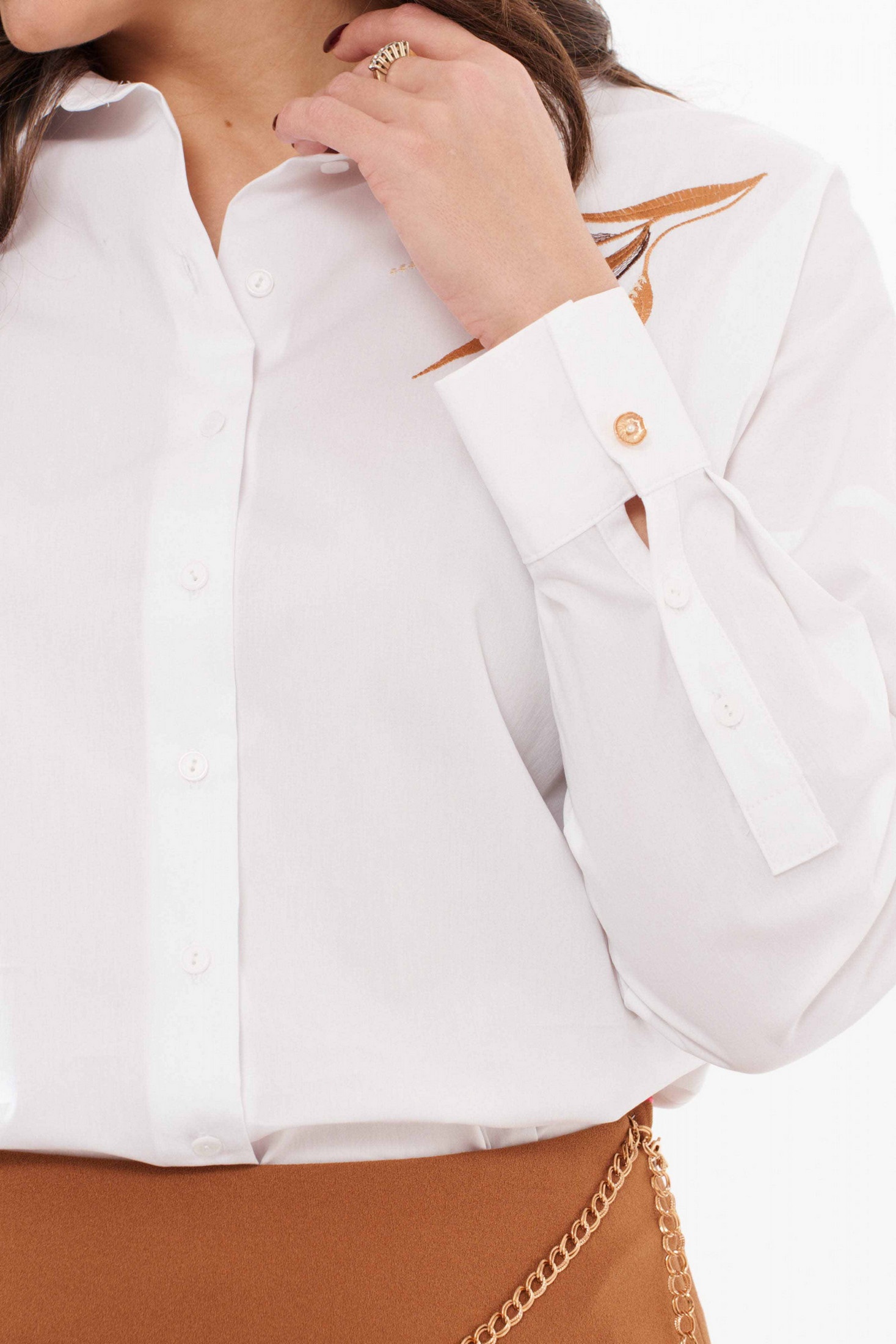 Блузка 11840 белый Panda - это сочетание стиля и комфорта. Коллекция бренда Panda предлагает женскую блузку с высоким содержанием хлопка, что обеспечивает комфорт в повседневной носке. Прямой силуэт легко впишется в любой гардероб, а дизайнерская вышивка в виде листиков добавляет оригинальности. Застежка на пуговицы с обметанными петлями подчеркивает стильность модели. Спинка с кокеткой и складкой, рубашечный воротник с отрезной стойкой и длинные втачные рукава создают непринужденный образ для офиса. Белый цвет и креативный дизайн привлекут внимание и станут вашей любимой вещью на каждый день.