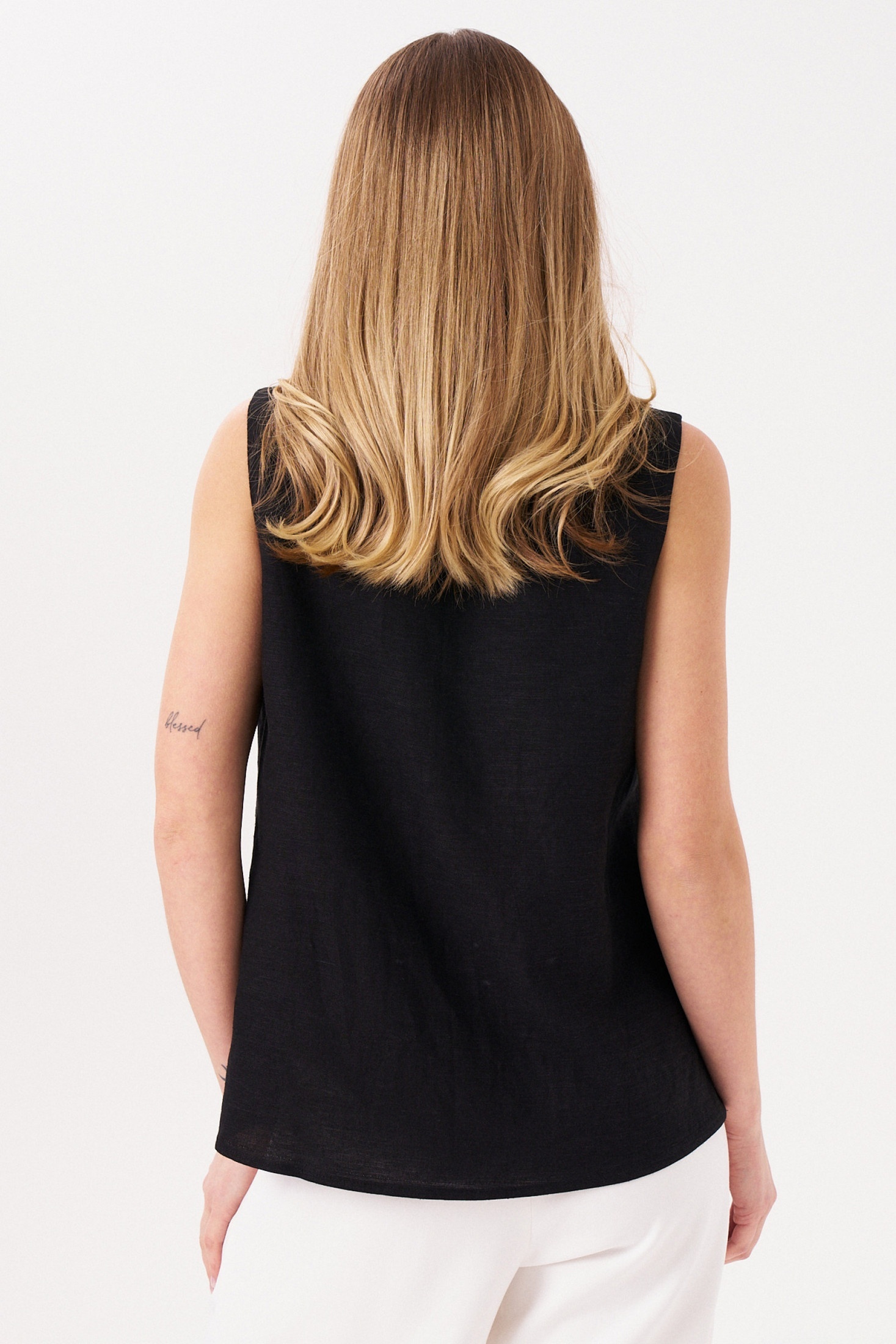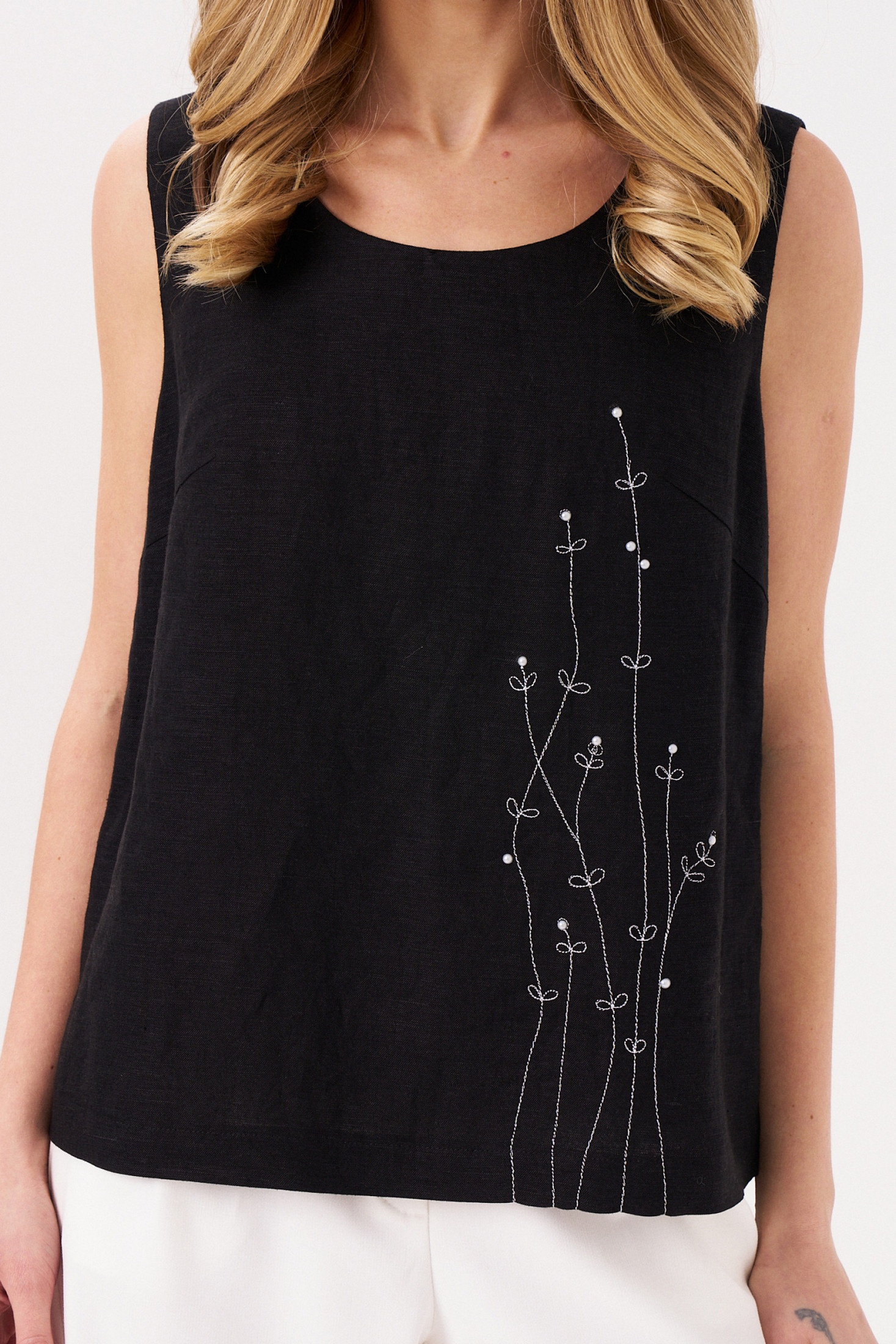 Блузка 16740 черный Panda — это идеальный выбор для вашего летнего гардероба. Коллекция бренда Panda поражает сочетанием стиля и комфорта. Льняная ткань с добавлением вискозы обеспечивает легкость и дышащие свойства, идеальные для теплых дней. Эта модель без рукавов предлагает прямой силуэт, украшенный изысканной вышивкой в виде веточек со стразами, что придает блузке праздничный акцент. Округлая горловина и боковые разрезы обеспечивают свободу движения и удобство, а удлиненная спинка визуально вытягивает силуэт. Благодаря универсальному черному цвету эта блузка легко сочетается с разными элементами гардероба, создавая стильный образ для повседневного или офисного использования.