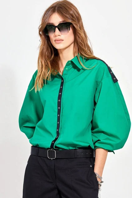 Блузка 2426-1 Rivoli от коллекции бренда Rivoli сочетает в себе стиль и удобство. Выполненная из смеси хлопка (55%) и полиэстера (45%), она обеспечивает комфорт и практичность в ежедневной носке. Полуприлегающий силуэт и спущенная линия плеча создают свободный и расслабленный стиль, подходящий как для офиса, так и для повседневной носки. Застёжка на пуговицы с потайной планкой и декор из тесьмы с металлическими элементами добавляют элегантности. Двухшовные рукава с манжетами подчеркивают уникальный дизайн. Яркий зелёный цвет оживляет образ, а хлопковая ткань делает её идеальной для весны и демисезона. Отличный выбор для создания стильного и современного образа.