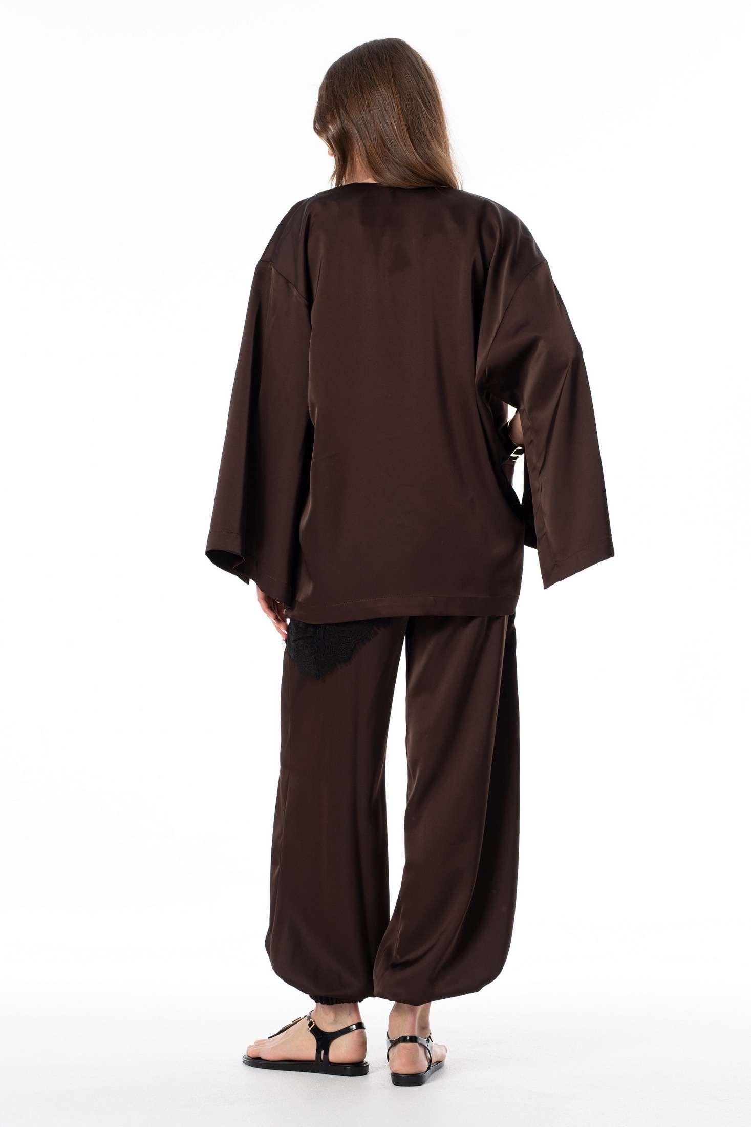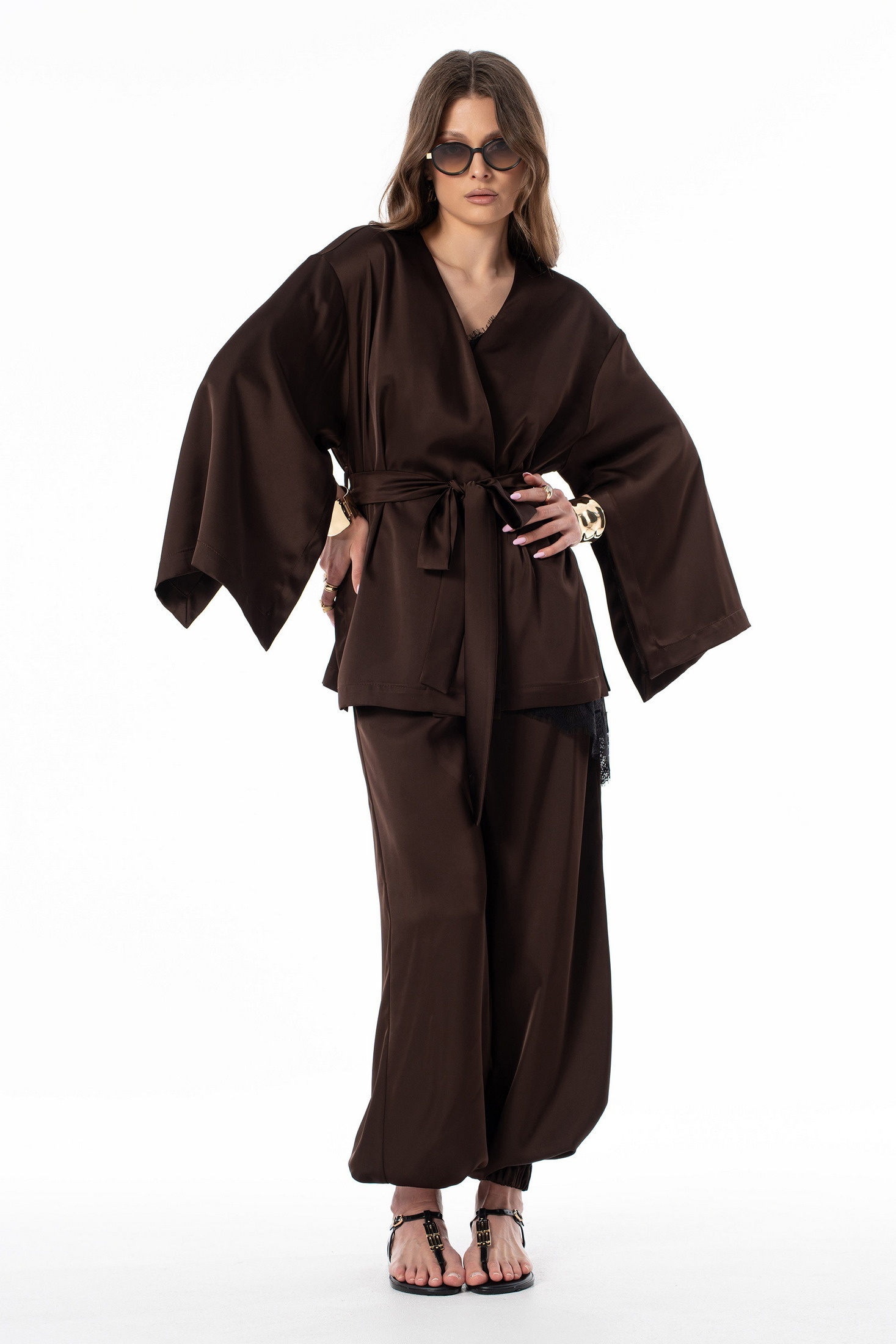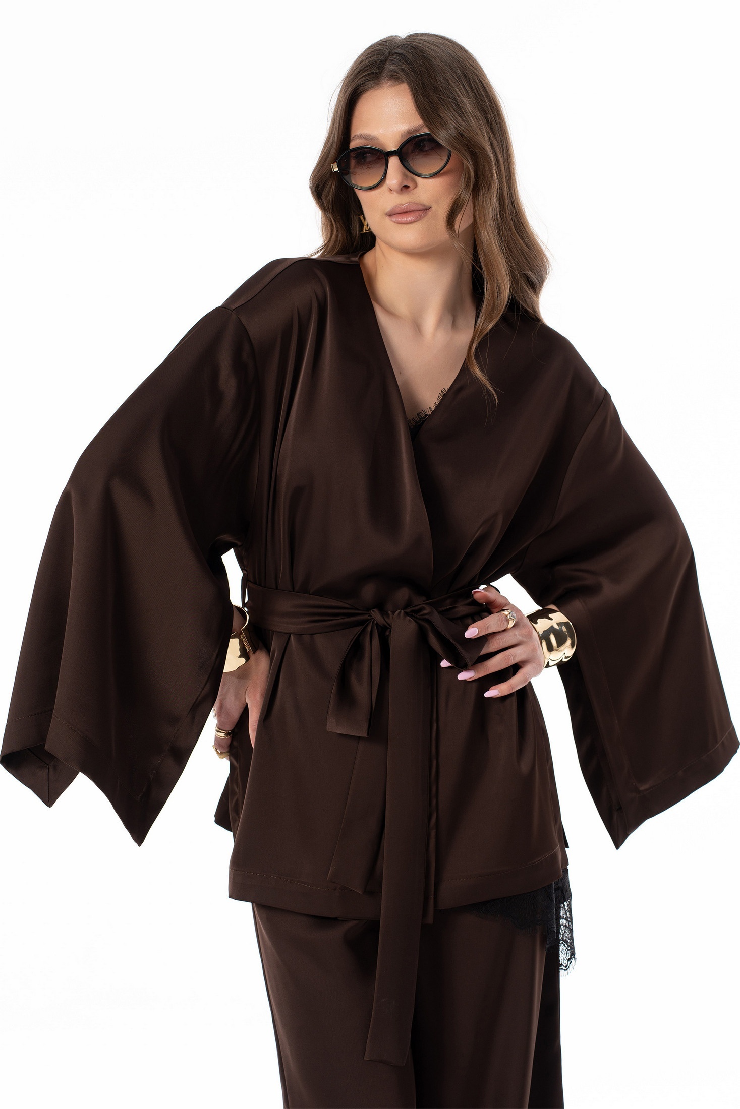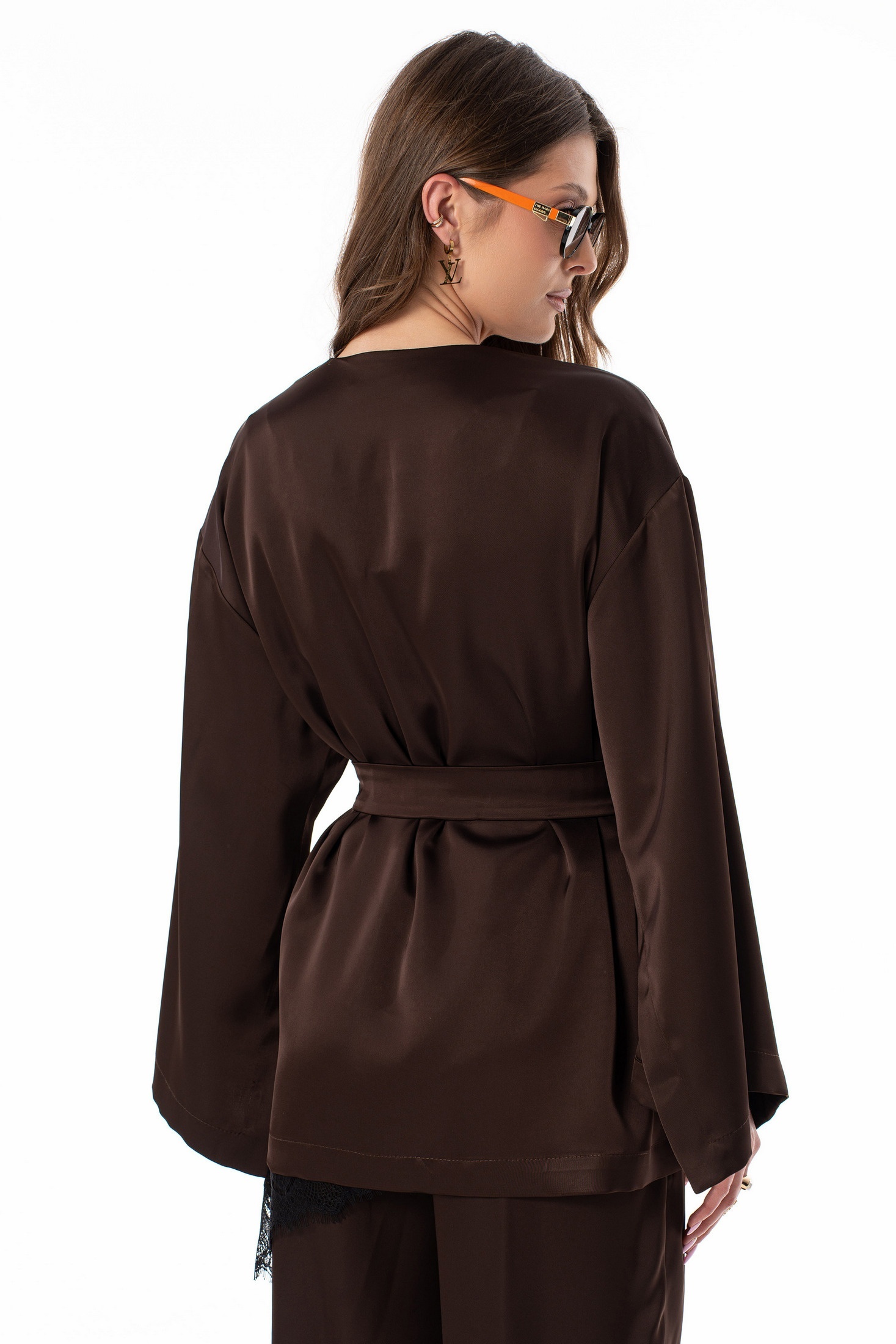 Блузка 7638 SILVERSPICE — изысканная модель в коллекции бренда SILVERSPICE. Изготовленная из шелковистой ткани с добавлением полиэстера, вискозы и эластана, она обеспечивает комфорт и легкость носки. Свободный фасон кимоно с завязкой из основной ткани подчеркивает талию, а широкий рукав с высоким разрезом добавляет изделию оригинальности. Шоколадный оттенок отлично подходит для осенне-весеннего сезона и привлекает внимание своим стильным видом. Длина кимоно по центру спинки достигает 72 см, а длина рукава от горловины составляет 71 см, что делает его идеальным для повседневных и праздничных мероприятий. Универсальная модель гармонично сочетается с различными элементами гардероба, создавая эффектный образ.
