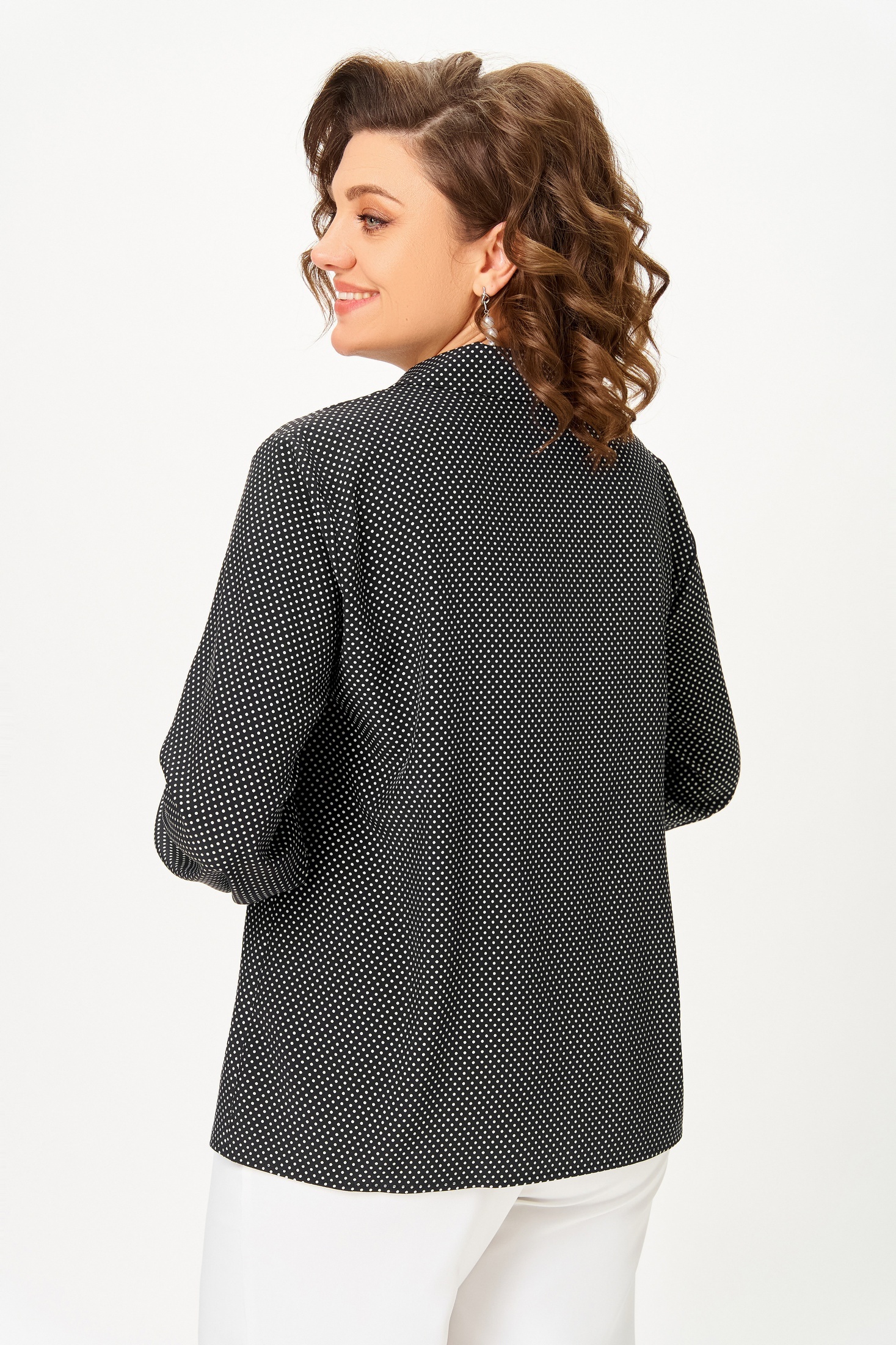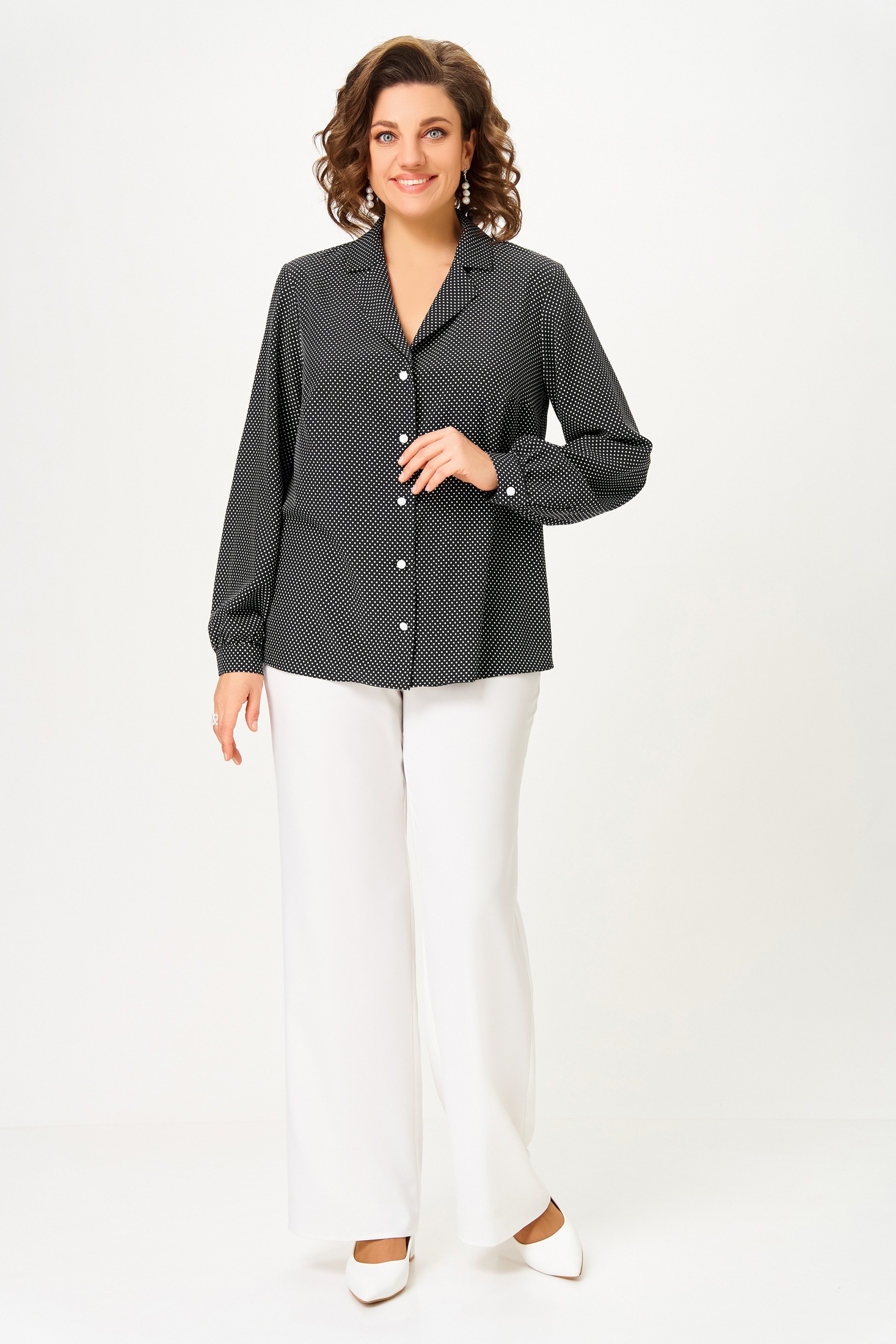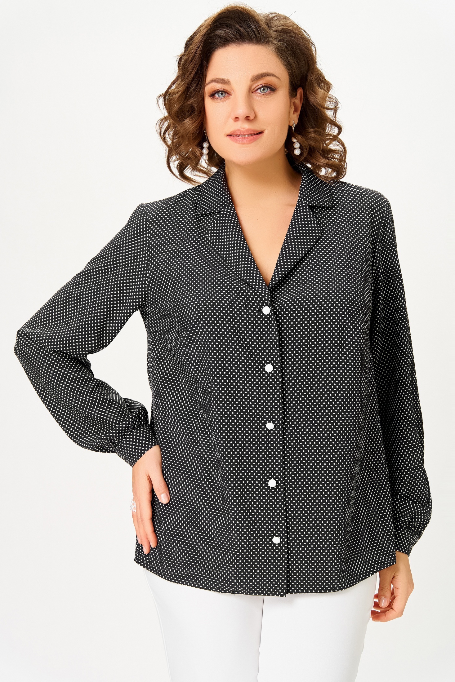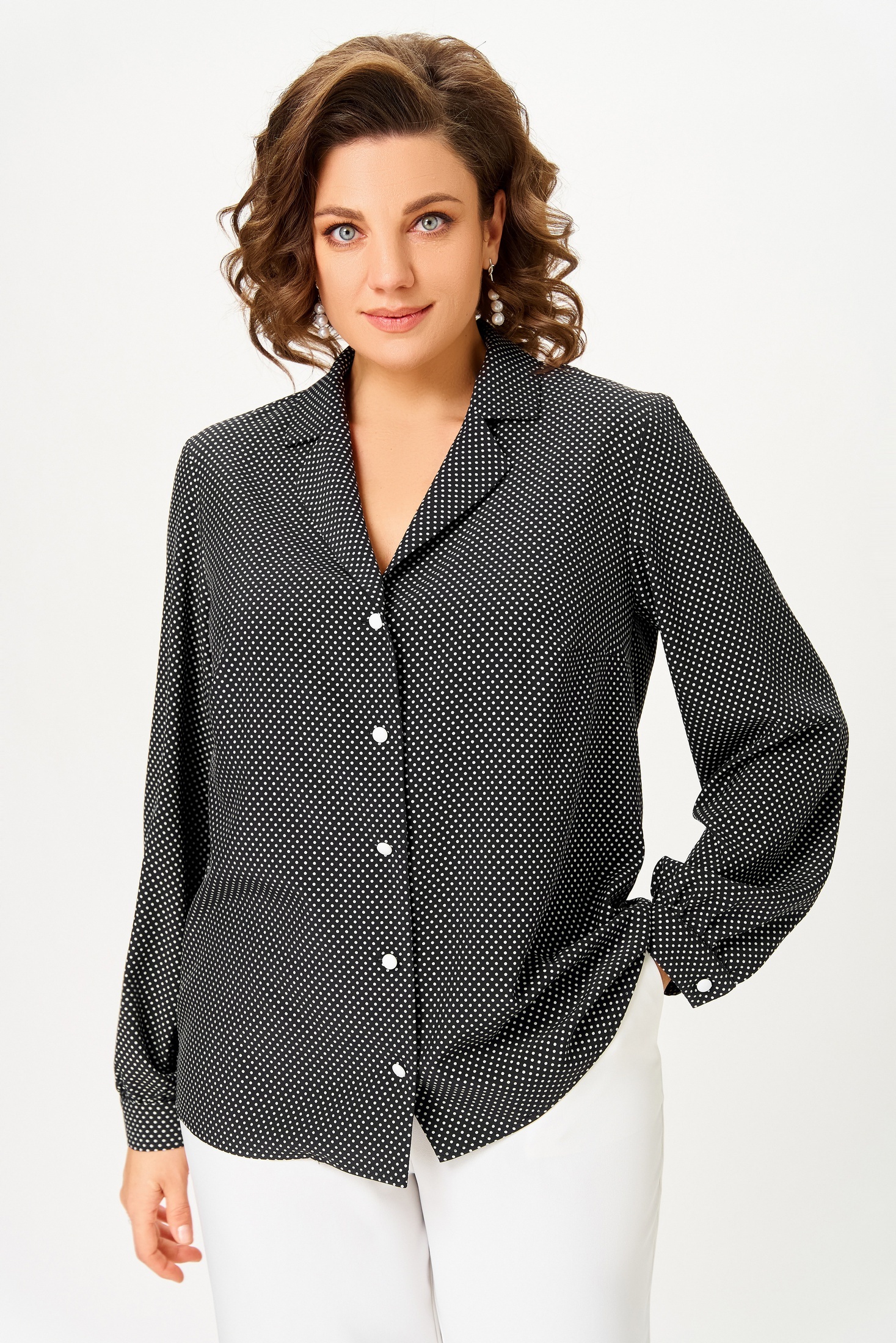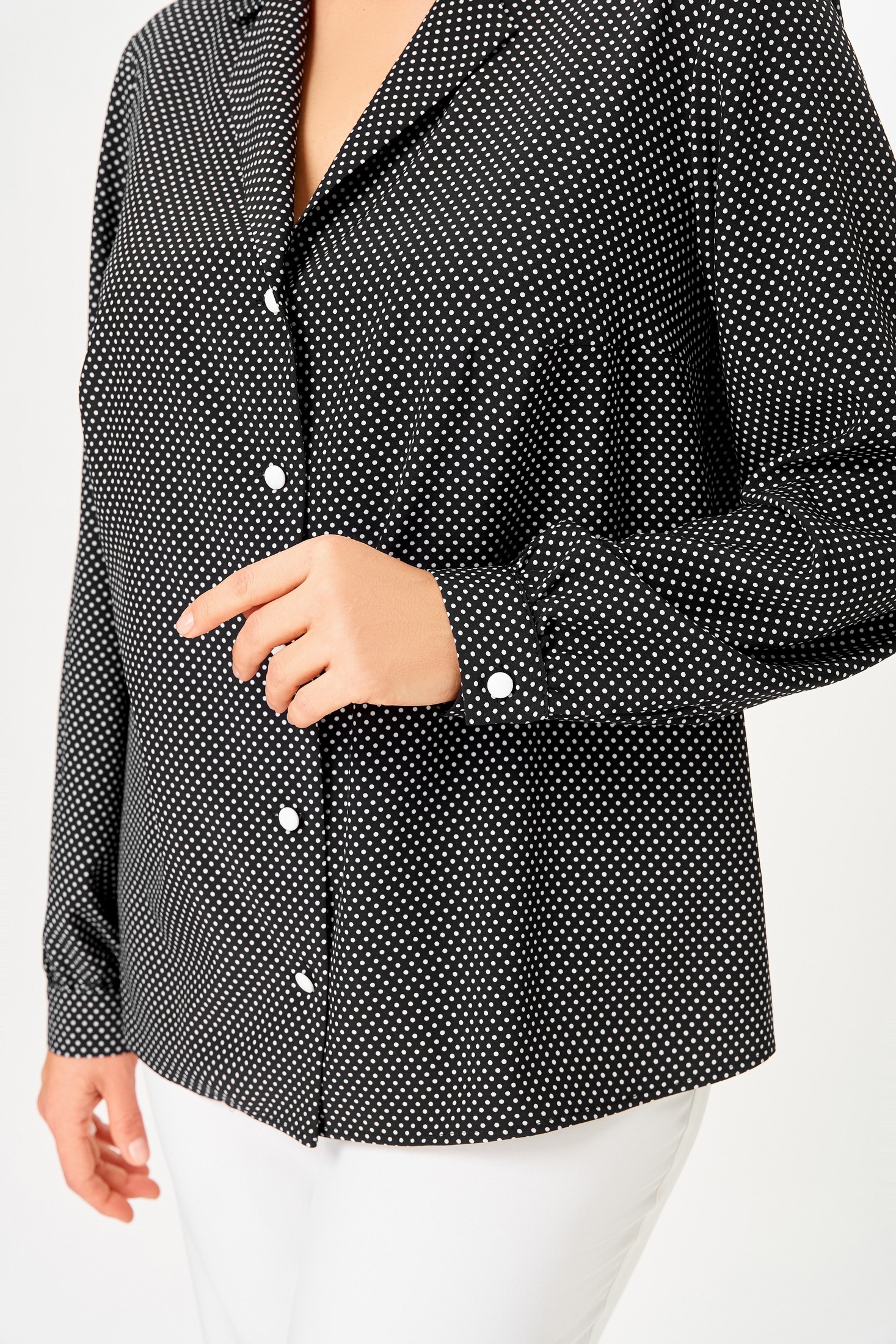 Блузка 842-4 Swallow от коллекции бренда Swallow предлагает современный взгляд на офисный стиль. Изготовленная из вискозной ткани с добавлением полиэстера и эластана, она обеспечивает комфорт и легкость в течение всего дня. Модель имеет прямой силуэт с центральной застежкой на петли и декоративные пуговицы. Воротник отложной с лацканами пиджачного типа придает образу строгость. Длина рукава составляет 61 см, а длина по центру спинки — 64 см. Это идеальный выбор для офисного гардероба благодаря универсальному черно-белому цвету и мелкому горошку. Стильный вариант для межсезонья благодаря практичным длинным рукавам и манжетам на пуговицах.