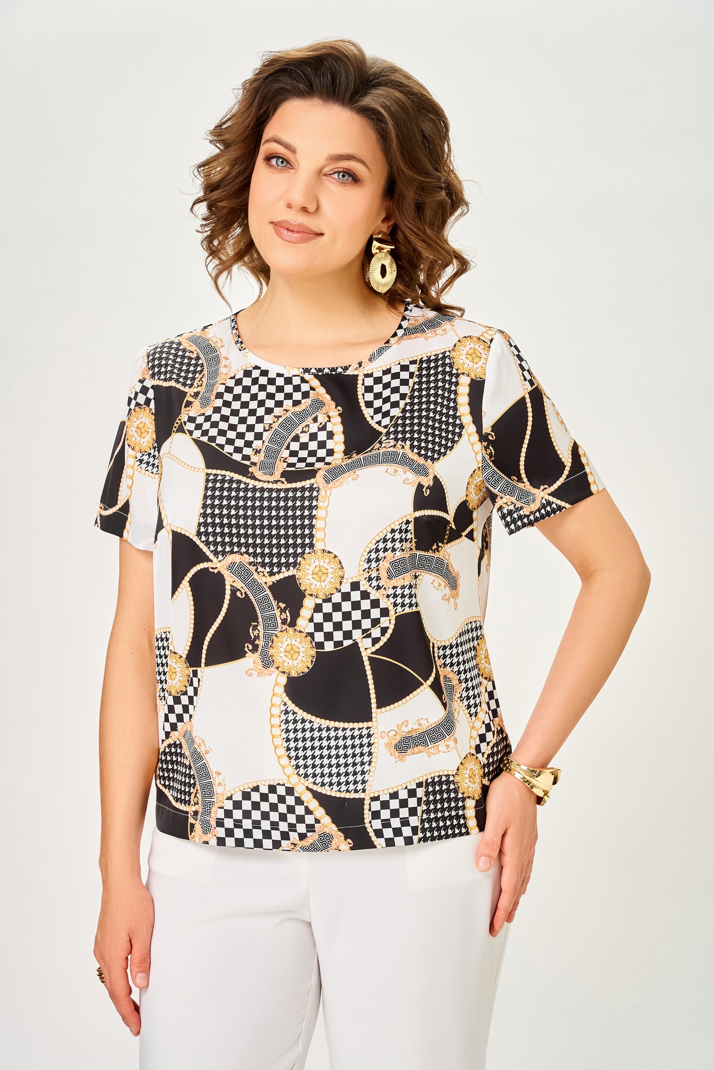 Блузка 917-3 Swallow из коллекции бренда Swallow выполнена из нежной ткани «Армани», имитирующей шелк. Прямой силуэт и округлая горловина подчеркивают элегантность этой женской блузы. Модель дополнена нагрудной вытачкой и цельнокроеной спинкой, что обеспечивает идеальную посадку. Втачной рукав длиной 21-28 см (±1 см) добавляет легкость и комфорт в ношении. Длина изделия варьируется от 58 до 67 см (+/-1 см), что делает ее идеальной для повседневного гардероба. Блузка выполнена в черно-белом цветовом решении и украшена оригинальным принтом с геометрическими элементами. Подходит для весенне-летнего сезона и станет отличным выбором для офисного стиля или городских прогулок.
