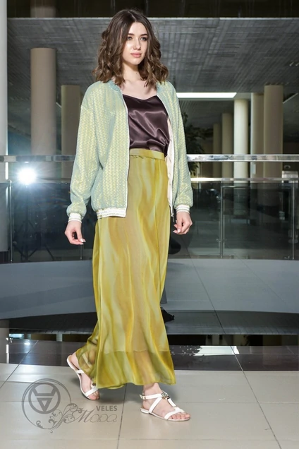 Модный бомбер из натурального вязаного гипюра-сетки с отделкой из полосатой резинки. Подкладка-подложка из натуральной ткани. Светло-жёлтого цвета. Застёжка на тесьму-молнию спереди.Длина изделия на рост 164-65 см, длина рукава-55 см. Длина изделия на рост 170-70 см, длина рукава-60 см.
