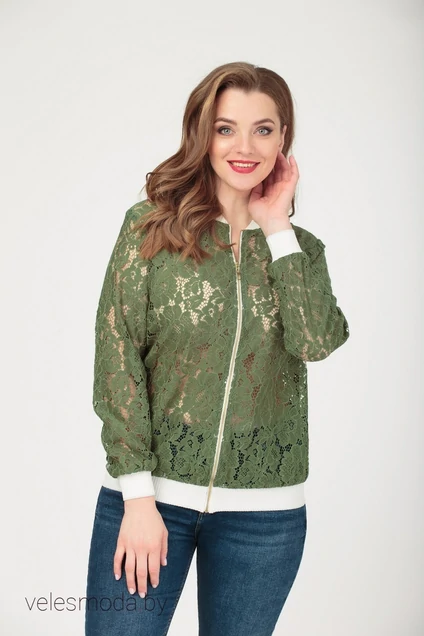 Бомбер женский из кружева зеленого цвета. Бомбер свободного силуэта. Перед и спинка цельные. Рукав длинный , одношовный, втачной. В горловину овальной формы вставлен воротник из довяза. По низу бомбера и низу рукава довяз. По переду застежка на металическую молнию. Длина бомбера-66см. Длина рукава -62см.
