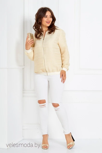 Бомбер женский из текстильной ткани на бежевой основе золотые металические нити. Рукав длинный , одношовный, втачной. В горловину овальной формы вставлен воротник из довяза. По низу бомбера и низу рукава довяз. По переду застежка на молнию. Длина бомбера (с поясом): (50-54)-62 . Длина рукава (с манжетой): (50-54)-61см., (56-60)-62см.