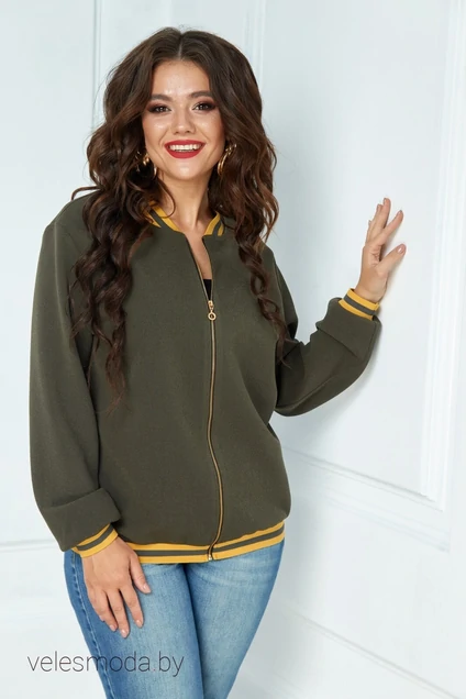 Бомбер из текстильной ткани. По переду-застежка на молнию. Горловина овальной формы, в которую вставлен воротник-стойка, плосколежащий, из довяза. Рукав одношовный, втачной, длинный. По низу рукава-манжета из довяза. К низу бомбера вставлен пояс из довяза. По горловине и молнии прострочена отделочная строчка на 0,5см.