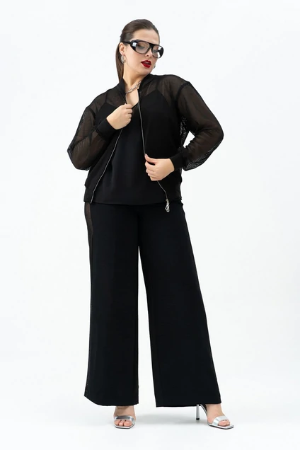 Модный соременный бомбер из сетки, с центральной бортовой застёжкой на металлическую тесьму-молнию. По горловине, по низу, и по низу рукавов обработан довяз, на полочках фигурные накладные карманы. Рукава втачные одношовные по низу с притачной манжетой.. Спинка цельная.