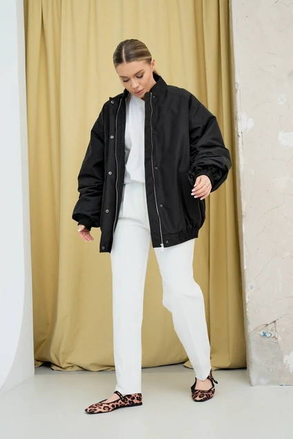 Бомбер в черном цвете. Выполнен в стиле оверсайз и отлично подойдет для создания актуальных трендовых образов. Бомбер имеет два кармана, воротник-стойку и застежку на кнопках. Рукава бомбера с манжетами на резинке в цвет всего бомбера.