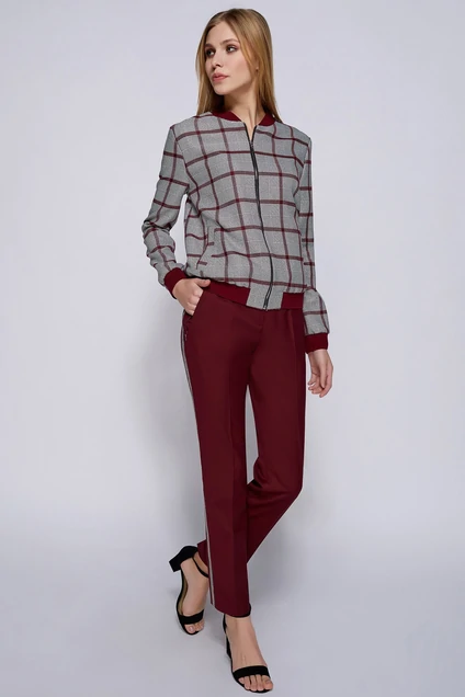 - бомбер, выполненный из ткани с рисунком в мелкую гусиную лапку и контрастную клетку, прямого силуэта с застёжкой на молнию и отделочной контрастной трикотажной тесьмой по горловине, низу рукавов и низу изделия