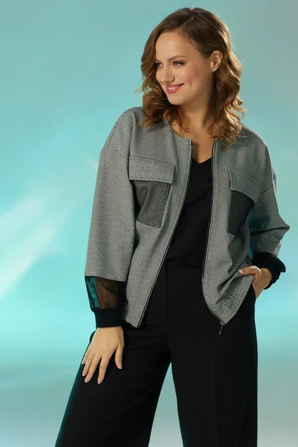 Стильный жакет-бомбер в стиле «кэжуал». Жакет с центральной застежкой на тесьму-молния, накладными карманами с наложением «сетки». Низ жакета на резинке. Рукав состоит из 2-х частей, нижняя деталь рукава из 2-х слоев сетки, а низ рукава на притачном довязе.