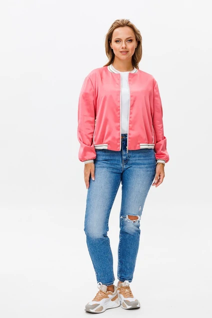 Бомбер выполнен из атласной ткани средней плотости с застежкой на молнии. Перед с рельефами и карманами на молнии. Горловина обработана довязом. Рукав втачной одношовный. Низ рукава и низ жакета собран на довяз. Жакет на подкладке. Длина жакета - 56 см, длина рукава жакета - 59 см.