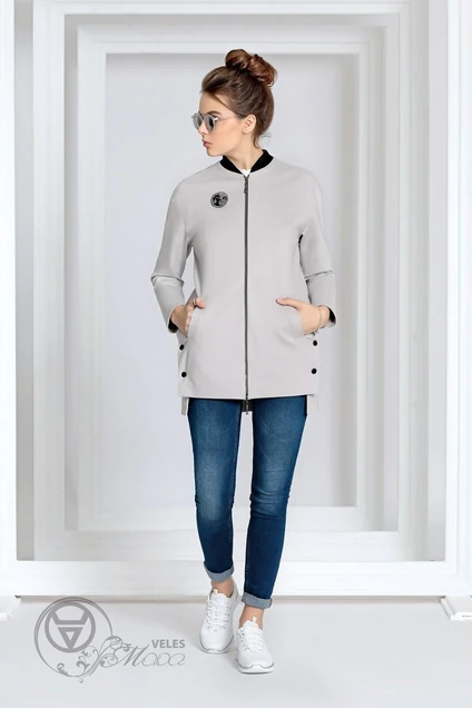 Удлиненный бомбер свободного кроя на подкладке, со спущенной линией плеча и ассиметричным низом. В боковых швах шлицы с застежкой на кнопки. Декорирован шевроном по передней полочке. Застежка на тракторную молнию. Длина по переду 75, по спинке 80, рукав от горловины 73.