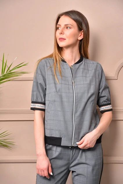 Бомбер на подкладке свободного силуэта, легкий и компактный, выполнен из тонкой шерстяной костюмной ткани высшего качества. Шерстяные костюмы позволяют телу дышать, а также они более износостойкие. Мягкая ткань с гладкой фактурой в спортивном образе легко носится и придаёт благородство и презентабельность внешнему облику. За счёт жаккардового плетения ниток, создаётся принт в клетку. Перед с нагрудными вытачками и центральной застежкой на разъёмную тесьму-молнию. По полочкам обработаны функциональные карманы. Спинка цельнокроеная. Рукава короткие втачные одношовные, с отрезной манжетой из трикотажного эластичного довяза. По низу куртки притачной пояс из дополнительной ткани с эластичной тесьмой.      Рекомендуем бомбер комплектовать с брюками КВ 2430. При покупке комплекта КВ 3022, вы можете существенно сэкономить.