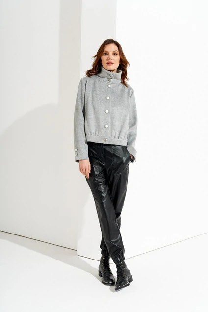 Бомбер с декоративными пуговицами серебристого цвета. Воротник стояче-отложной. Спереди по бокам кармашки с листочками. Рукав длинный с декоративной шлицей.