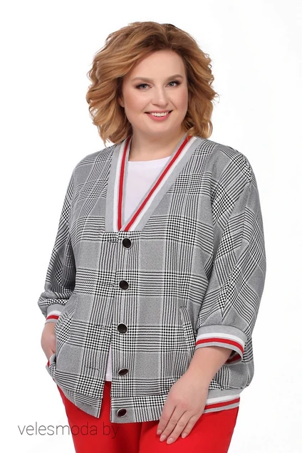 Бомбер с цельновыкроенными рукавами на манжетах в ¾ длины, застежка центральная бортовая на петли и пуговицы, прорезанные карманы, воротник переда, манжеты и низ обработаны с трикотажным довязом. Длина бомбера – 88см.