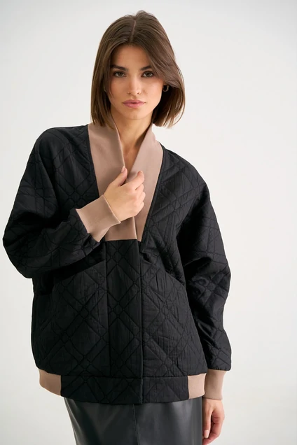 Бомбер свободного силуэта, комбинированный - стежка+кашкорсе. Застежка центральная - потайная на кнопки. Рукав спущенный с манжетам. Горловина с планкой из отделочной ткани. По переду выполнены накладные карманы с кнопкой.