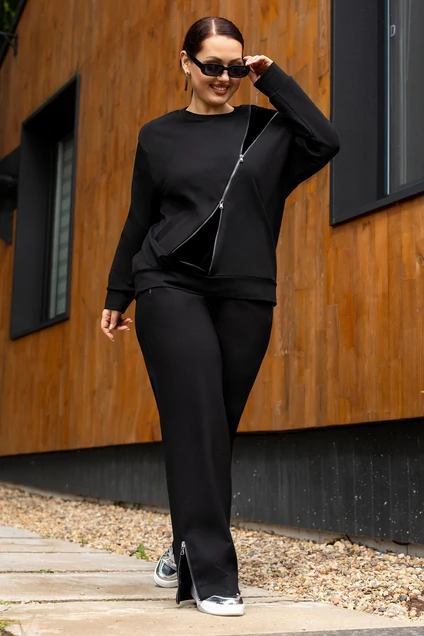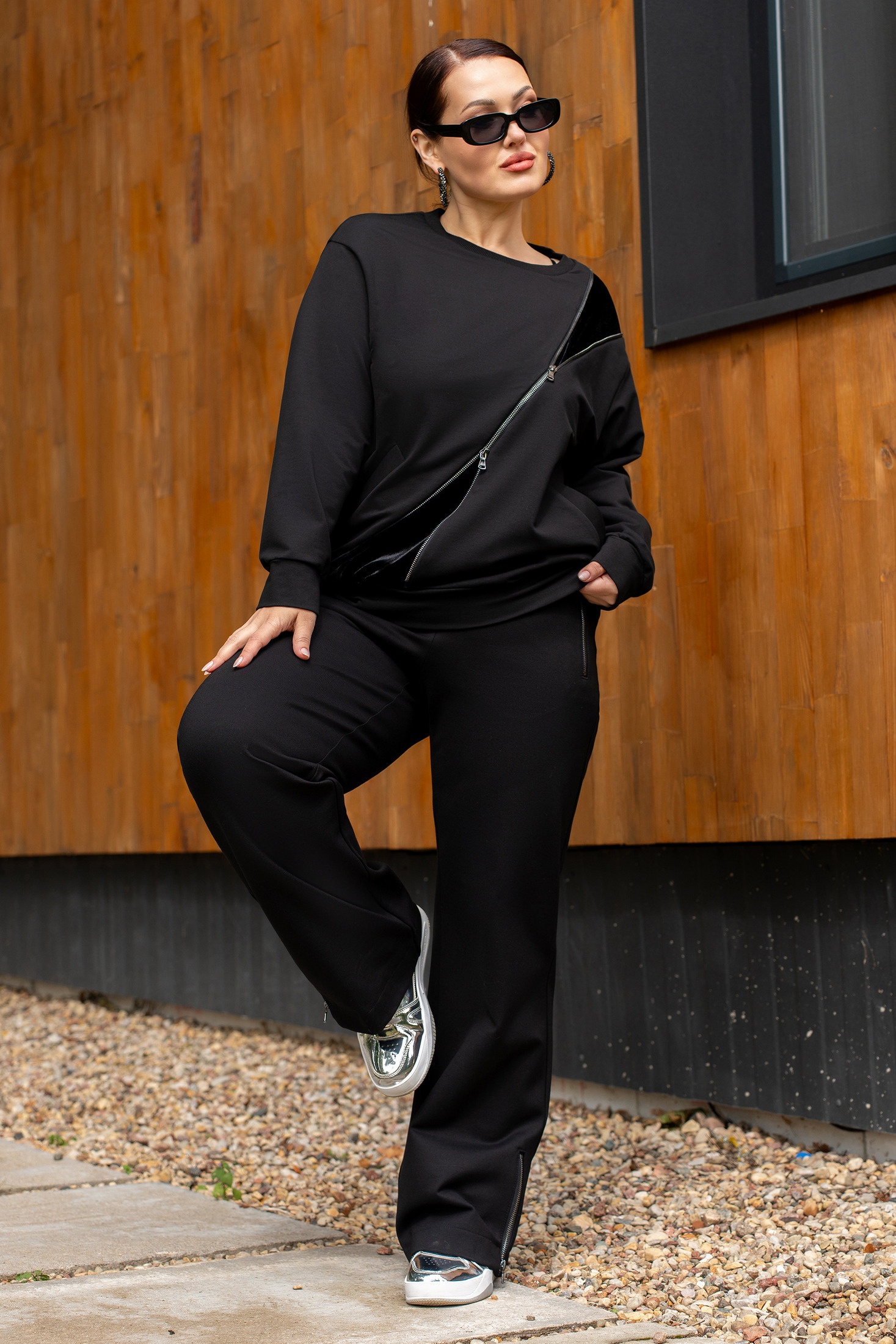 Элегантные женские брюки прямого силуэта из мягкого трикотажа черного цвета обеспечивают комфорт и стиль на каждый день. Модель с эластичным поясом для идеальной посадки. Боковые карманы на удобных молниях добавляют функциональности, а декоративные молнии на нижней части брюк подчеркивают уникальность дизайна. Эти брюки будут отлично смотреться в любой обстановке, подчеркивая ваше чувство стиля.