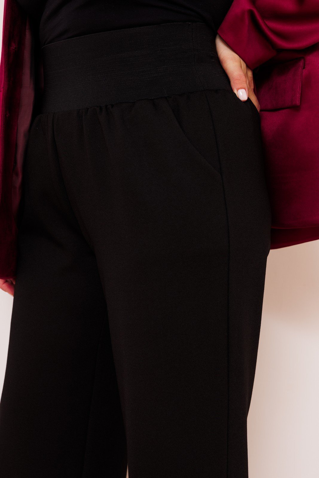 Элегантные женские брюки черного цвета из мягкого трикотажного полотна идеально сочетают в себе стиль и комфорт. Прямой крой делает их универсальным элементом гардероба для любого случая. Особенностью модели является широкая эластичная резинка на талии, которая подчеркивает силуэт и обеспечивает идеальную посадку. Практичный карман с отрезным бочком на передних половинках добавляет удобства в использовании. Длина изделия составляет 112 см по боковому шву, что делает брюки максимально функциональными и подходящими для любого роста.