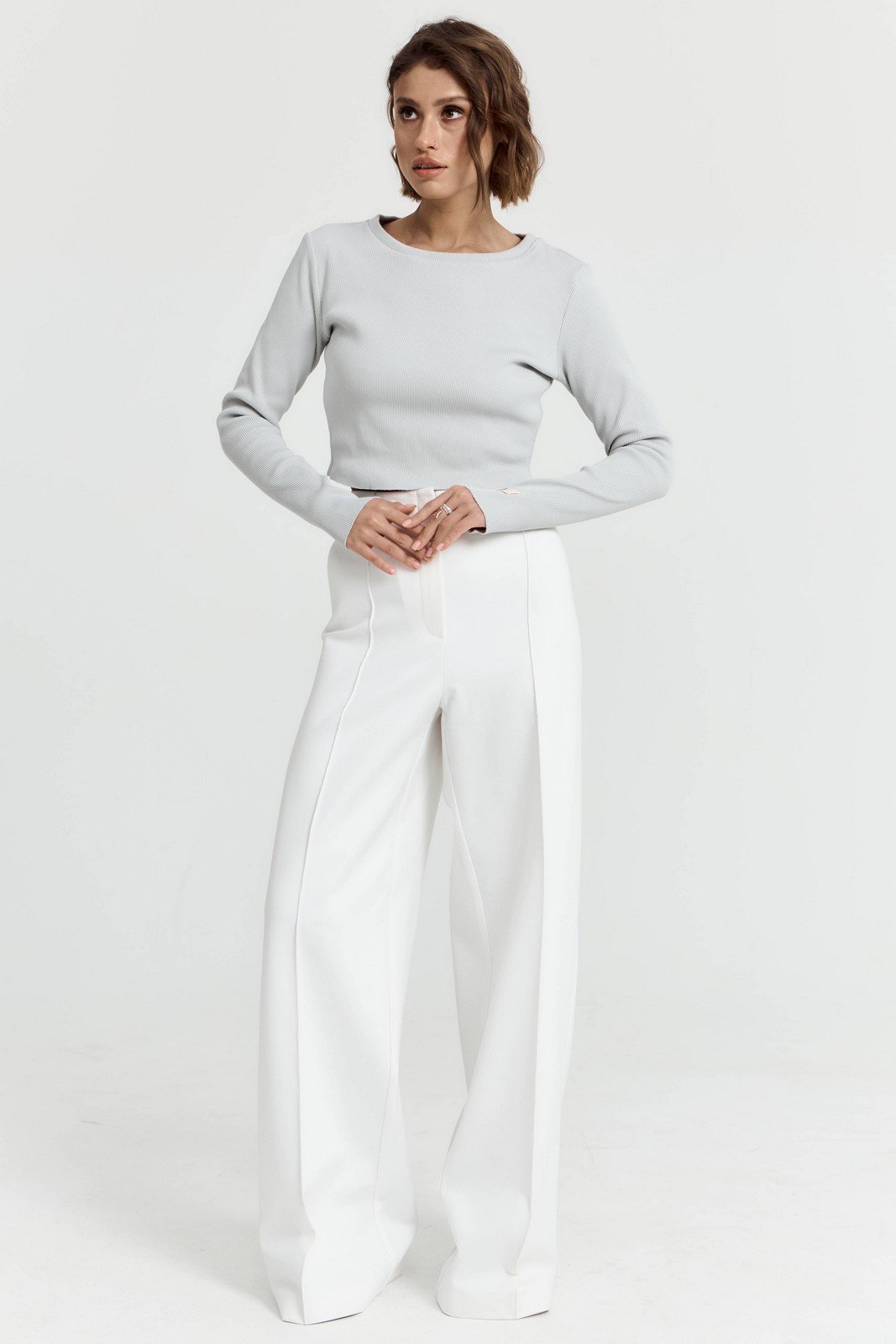 Брюки прямого свободного кроя выполнены из трикотажной ткани. Пояс стабильный. Брюки приталенные, расширенные к низу. По передней части прошитые швы. Длина брюк 114.