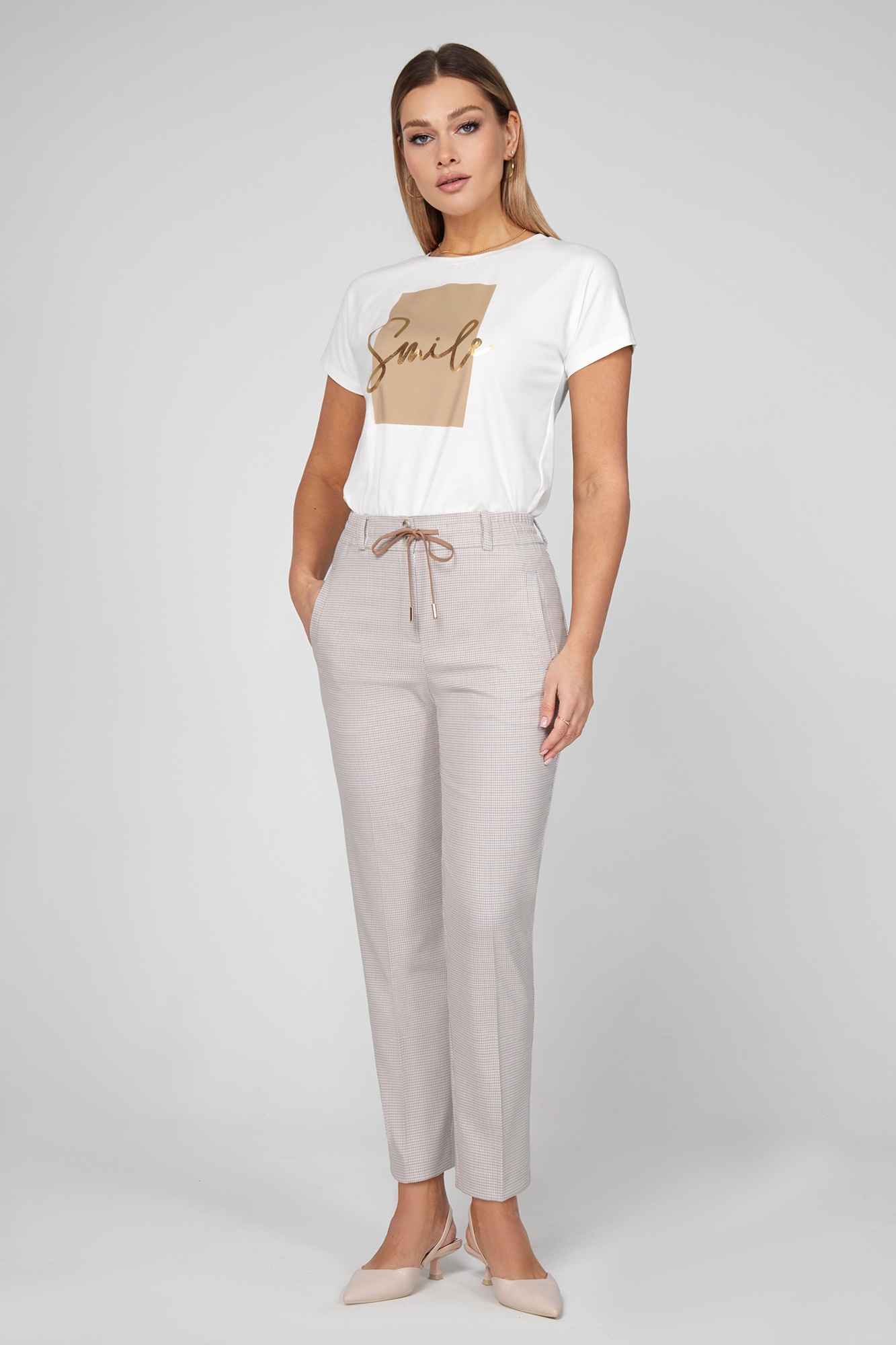 Лаконичные брюки со стрелками выполнены из приятной к телу испанской ткани с добавлением вискозы с интересным контрастным узором в виде мелкой гусиной лапки. Модель на притачном поясе с застежкой на молнию и петлю- пуговицу и дополнена кулисой и практичными вертикальными карманами с листочками. Эластичная часть пояса обеспечивает комфортную посадку на талии. Брюки отлично комплектуются с рубашкой или свитшотом из коллекции, формируя стильный сет на каждый день.