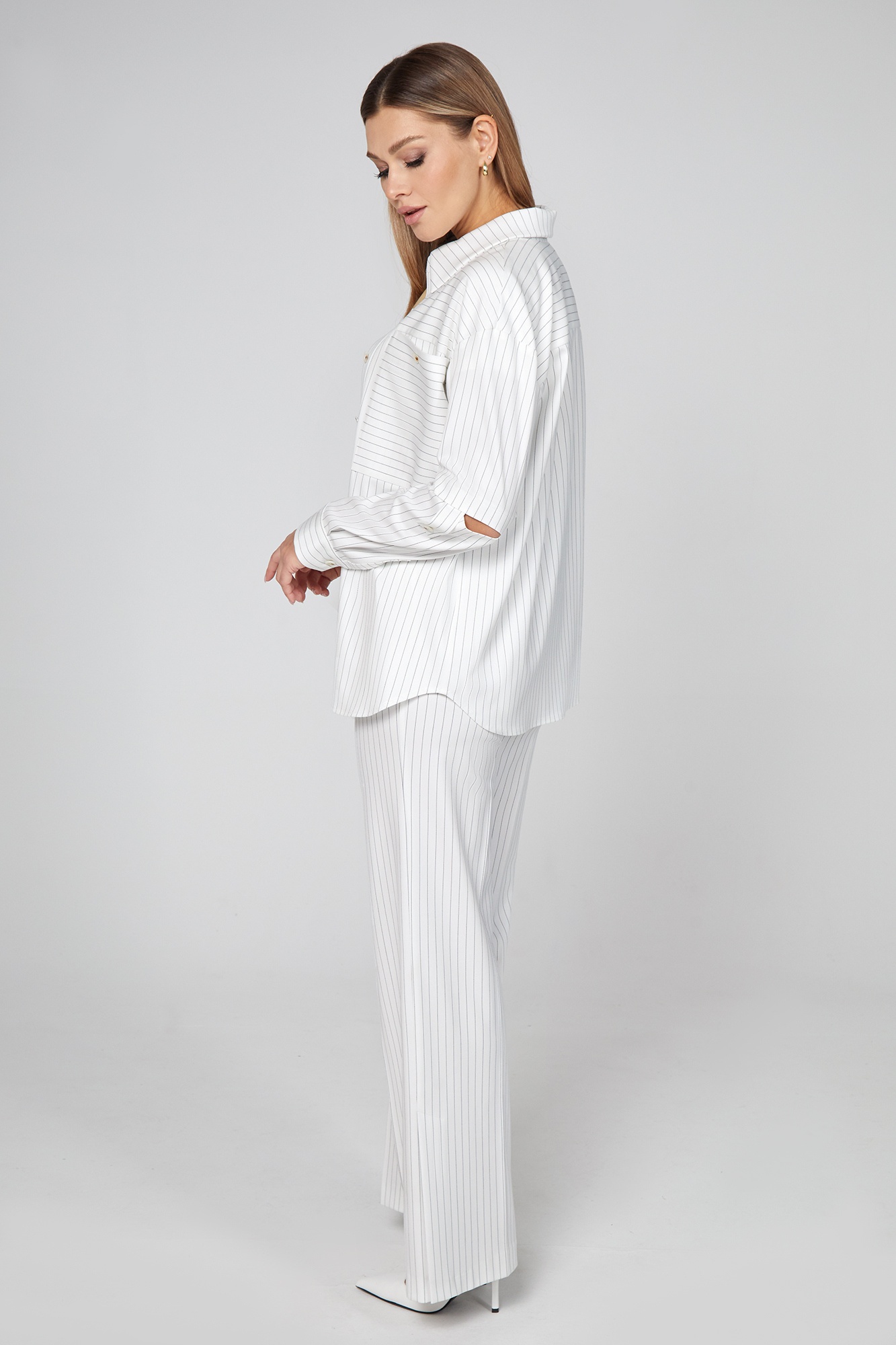 Модное обновление: эти светлые широкие брюки с полосатым узором из эластичной поливискозной испанской ткани привнесут глоток свежего воздуха в ваш гардероб. Современный дизайн в сочетании с модным кроем делают эту базовую модель привлекотельной. Изделие на притачном поясе со шлёвками, собранном на эластичную тесьму по спинке, спереди застёжка на молнию и петли-пуговицы и функциональные косые карманы.Модель дополнена контрастным поясом-тесьмой с пряжками, делающим образ более современным. Идеальный стиль с соответствующим жакетом или блузкой для городского модного образа.