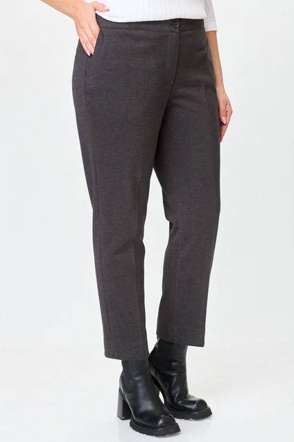 Классические брюки, из плотной теплой трикотажной ткани, на сезон осень-зима, прямые, слегка заужены к низу,заутюжены стрелки,по переду обработаны карманы с отрезным бочком,застежка на тесьму-молнию и 1 пуговицу.На задних половинках обработаны вытачки и имитация карманов в рамку с двумя обтачками,пояс в брюках притачной. По низу брюк в боковом шве есть небольшой разрез. Длина брюк от талии по боковому шву 93 см.