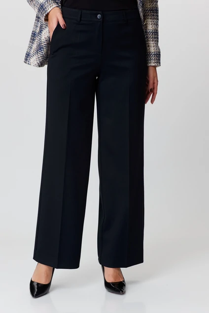 Брюки-палаццо, средней ширины,из плотной текстильной ткани,на сезон осень-зима, выполнены с карманами с отрезным бочком в боковом шве. Пояс притачной, застёжка на молнию. По задним половинкам обработаны вытачки.По боковым швам резинка. Длина по боковому шву 108 см.